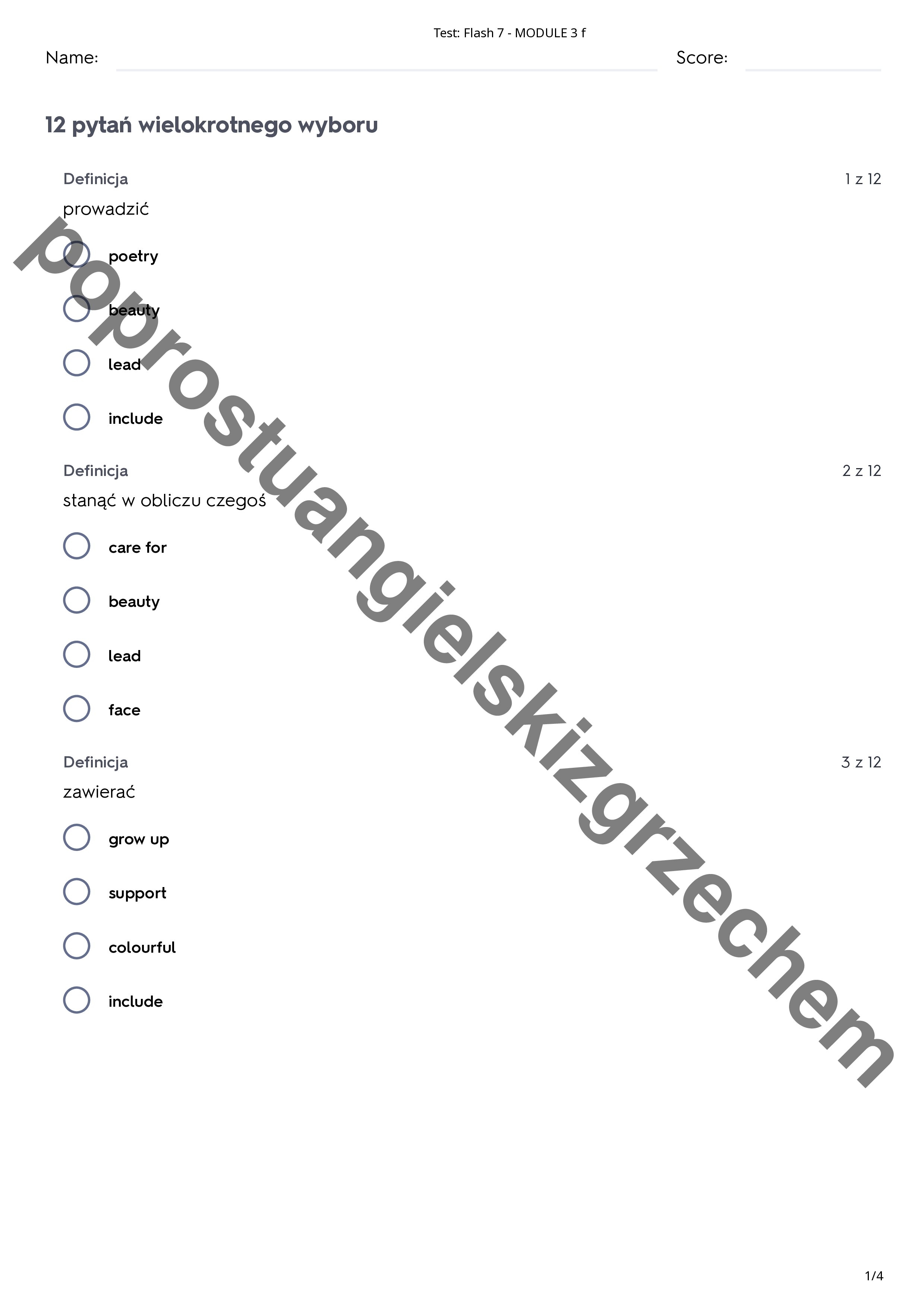 Zestaw zawiera 56 słówek z działu trzeciego do podręcznika Flash 7. Testy podzielone są na 4 podrozdziały, a każdy z nich na 4 kategorie zadań (prawda/fałsz, dopasuj, wielokrotny wybór, pisemny)