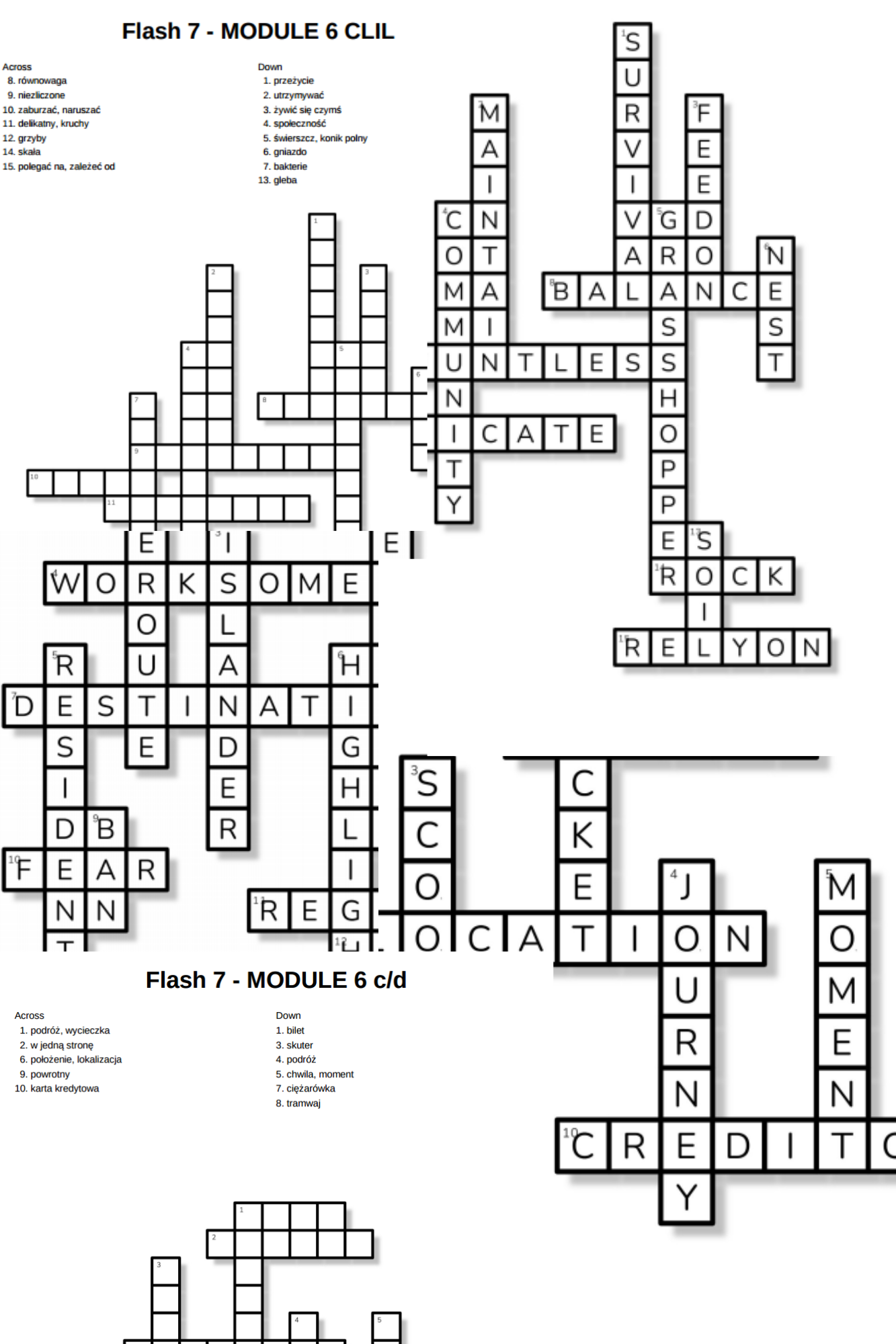 Zestaw zawiera 4 krzyżówki obejmujące słówka z działu szóstego do podręcznika Flash 7: