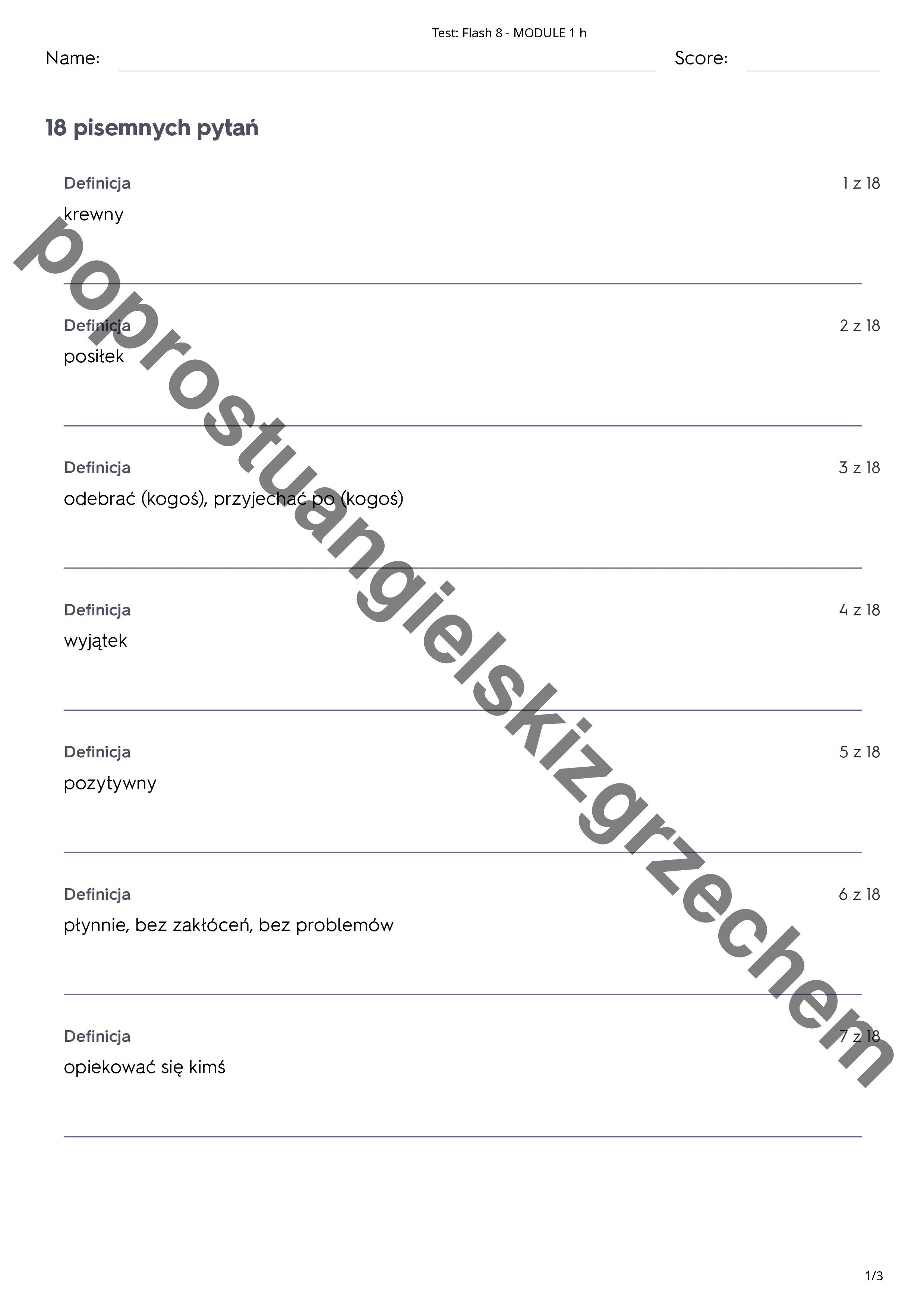 Zestaw zawiera 77 słówek z działu pierwszego do podręcznika Flash 8. Testy podzielone są na 5 podrozdziałów, a każdy z nich na 4 kategorie zadań (prawda/fałsz, dopasuj, wielokrotny wybór, pisemny)