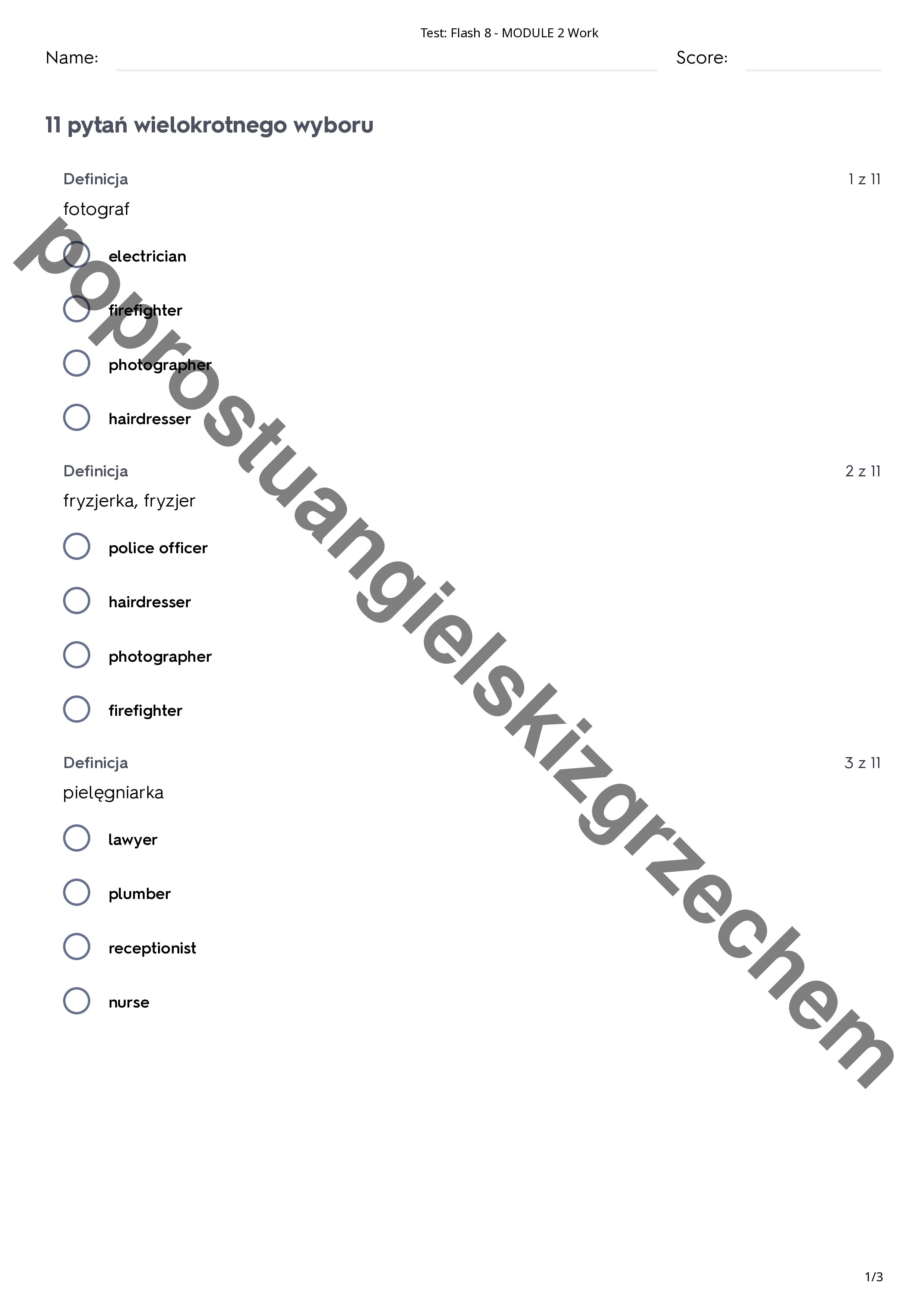 Zestaw zawiera 121 słówek z działu drugiego do podręcznika Flash 8. Testy podzielone są na 6 podrozdziałów, a każdy z nich na 4 kategorie zadań (prawda/fałsz, dopasuj, wielokrotny wybór, pisemny)