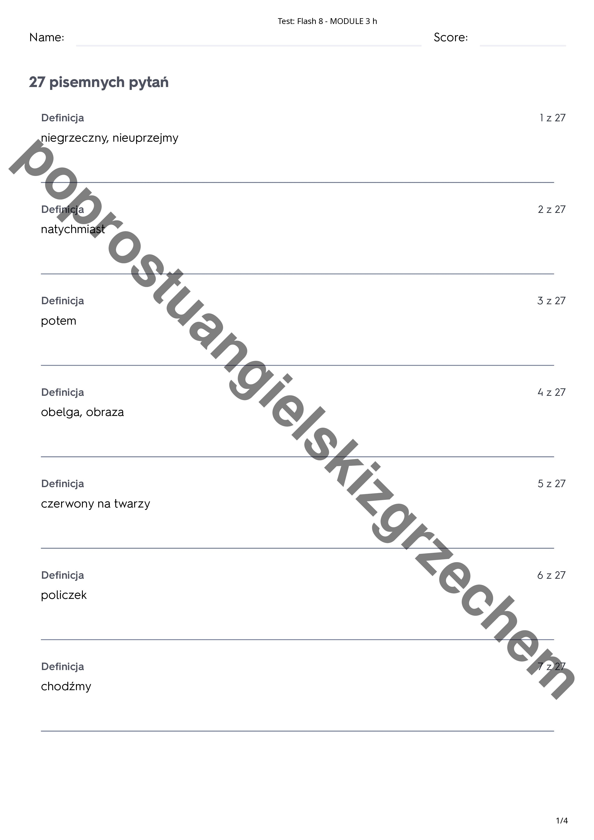 Zestaw zawiera 93 słówka z działu trzeciego do podręcznika Flash 8. Testy podzielone są na 5 podrozdziałów, a każdy z nich na 4 kategorie zadań (prawda/fałsz, dopasuj, wielokrotny wybór, pisemny)