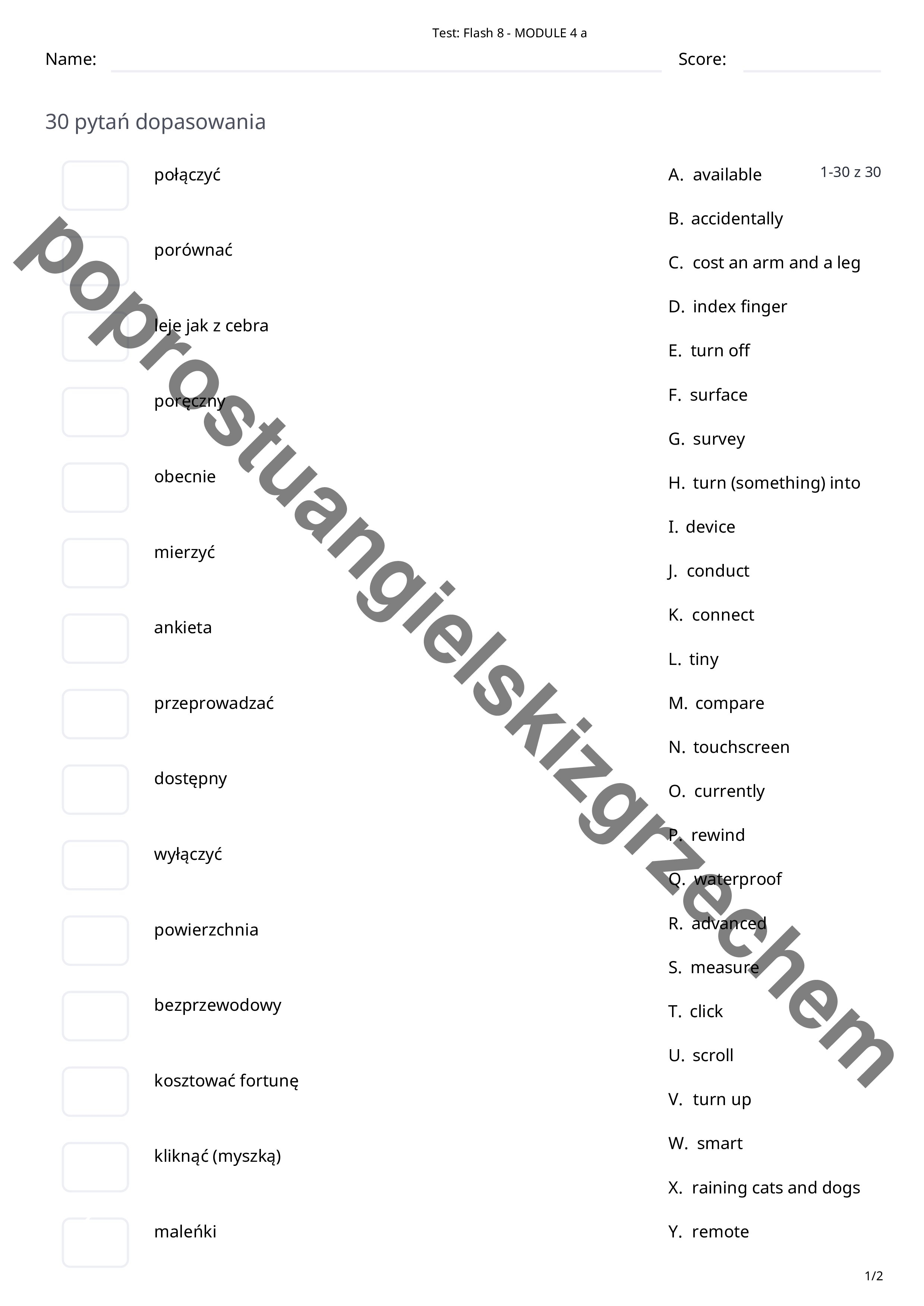 Zestaw zawiera 69 słówek z działu czwartego do podręcznika Flash 8. Testy podzielone są na 4 podrozdziały, a każdy z nich na 4 kategorie zadań (prawda/fałsz, dopasuj, wielokrotny wybór, pisemny)