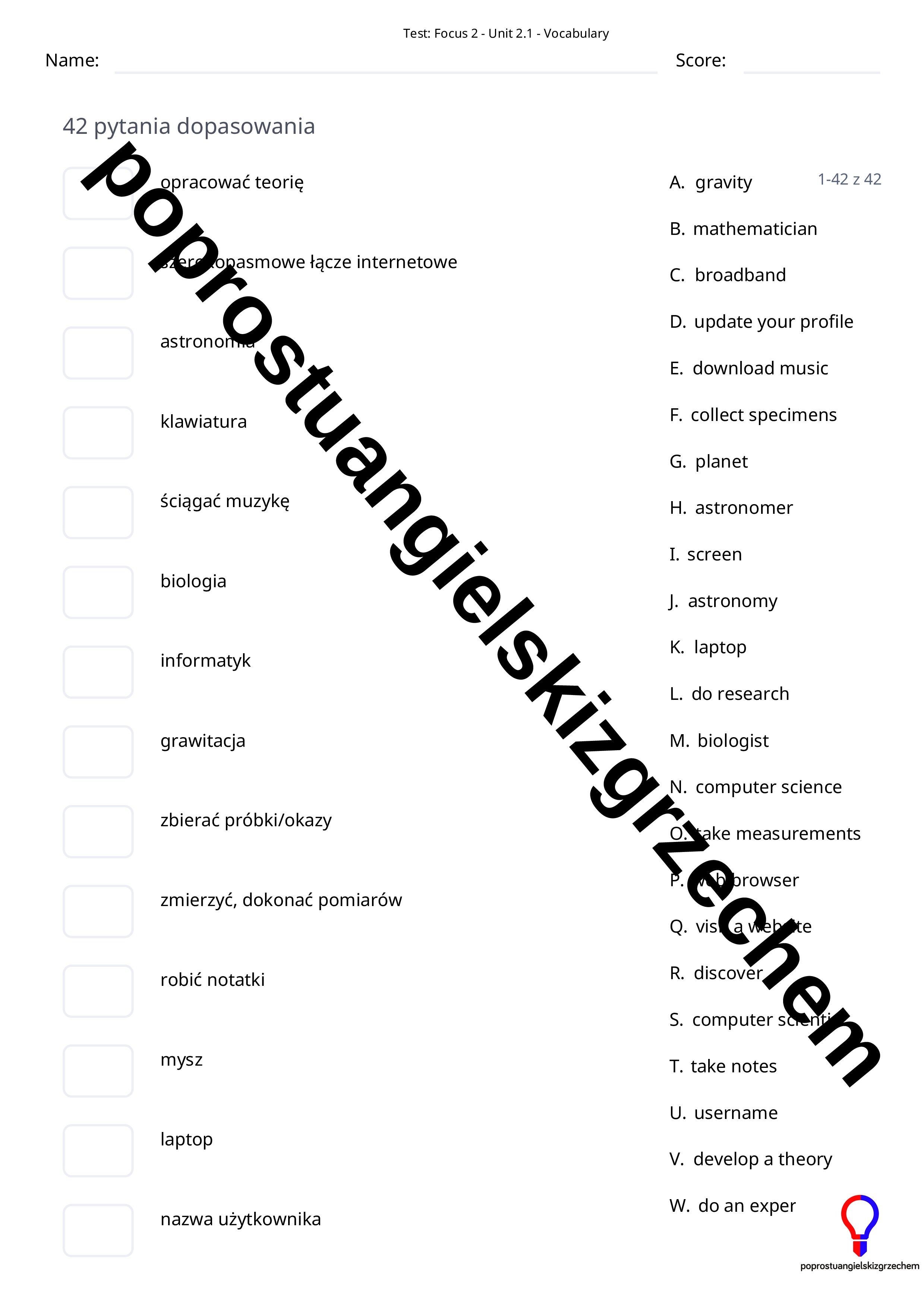 Zestaw zawiera 151 słówek z działu drugiego do podręcznika Focus 2. Testy podzielone są na 6 podrozdziałów, a każdy z nich na 4 kategorie zadań (prawda/fałsz, dopasuj, wielokrotny wybór, pisemny)