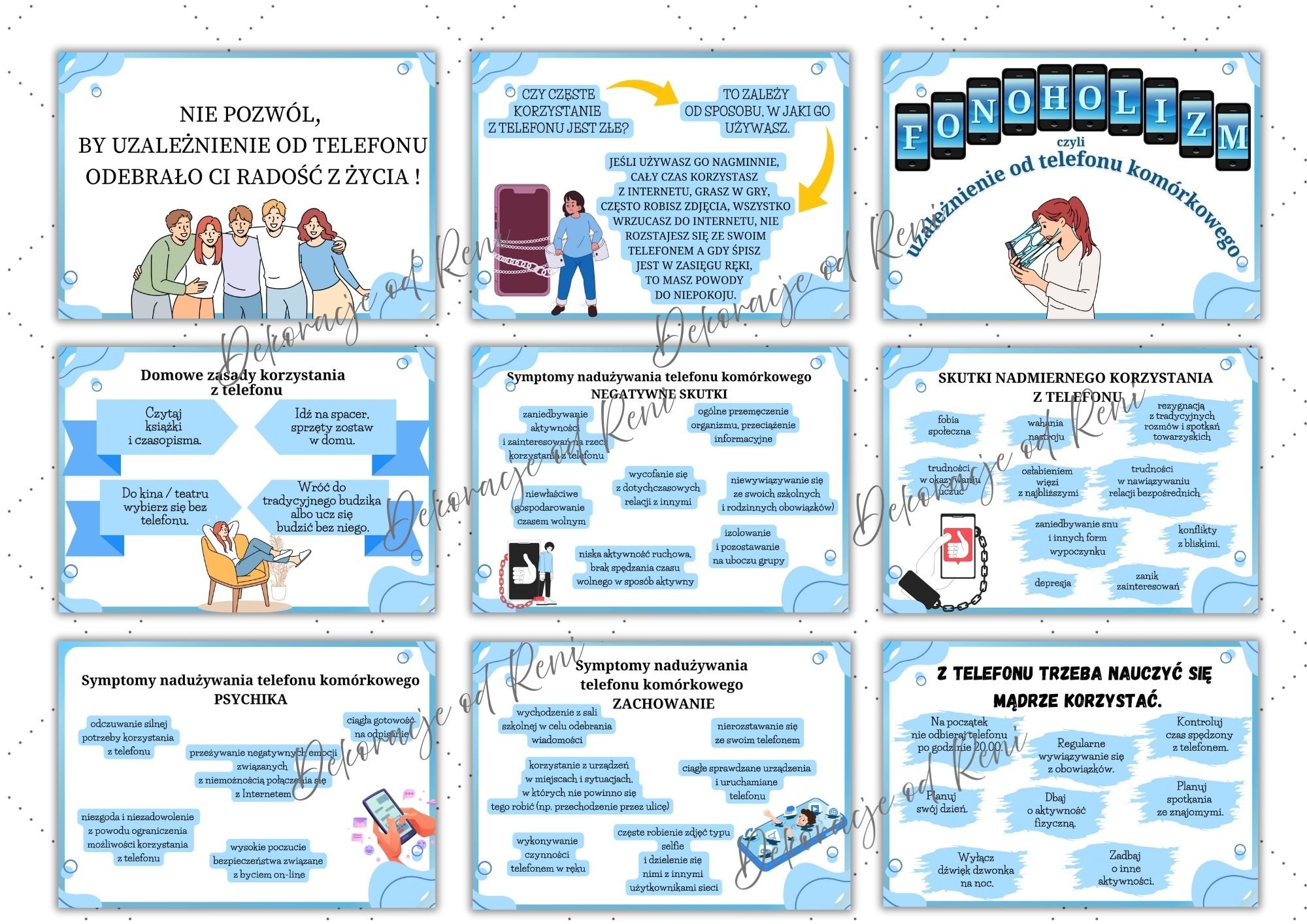 Materiał na szkolną gazetkę - FONOHOLIZM czyli uzależnienie od telefonu komórkowego. Materiał zamieszczony jest na 27 stronach A5. Dodatkowo dodana jest wersjaA5, która ułatwi rozmieszczenie materiału na gazetce.