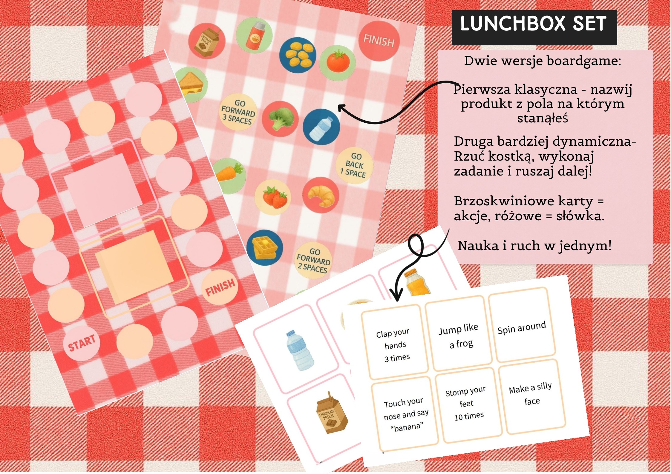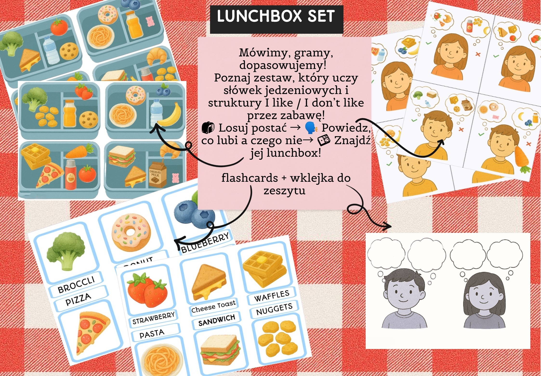 🧃 Lunchbox Set – smakowita nauka języka! Poznaj Lunchbox Set – interaktywny zestaw edukacyjny, który wprowadza dzieci w świat słownictwa jedzeniowego oraz struktury I like / I don’t like w języku angielskim. 👧🧒 Uczniowie losują kartę przedstawiającą dziewczynkę lub chłopca i na podstawie ilustracji mówią, co dana postać lubi, a czego nie. Ćwiczą przy tym wymowę, intonację i płynność wypowiedzi w języku obcym. 🍱 Następnie muszą odnaleźć odpowiedni lunchbox – ten, który pasuje do preferencji dziecka z karty. To świetna zabawa w logiczne dopasowywanie, która angażuje całą klasę! 📚 W zestawie znajdziesz także: • Flashcards z podpisami – do utrwalania słownictwa • Wklejkę do zeszytu – dzieci piszą o sobie: co lubią, a czego nie, a potem przedstawiają to klasie • Dwie gry planszowe : - jedna klasyczna, druga z kartami: brzoskwiniowe karty – zadania do wykonania, różowe karty – obrazki do nazwania
