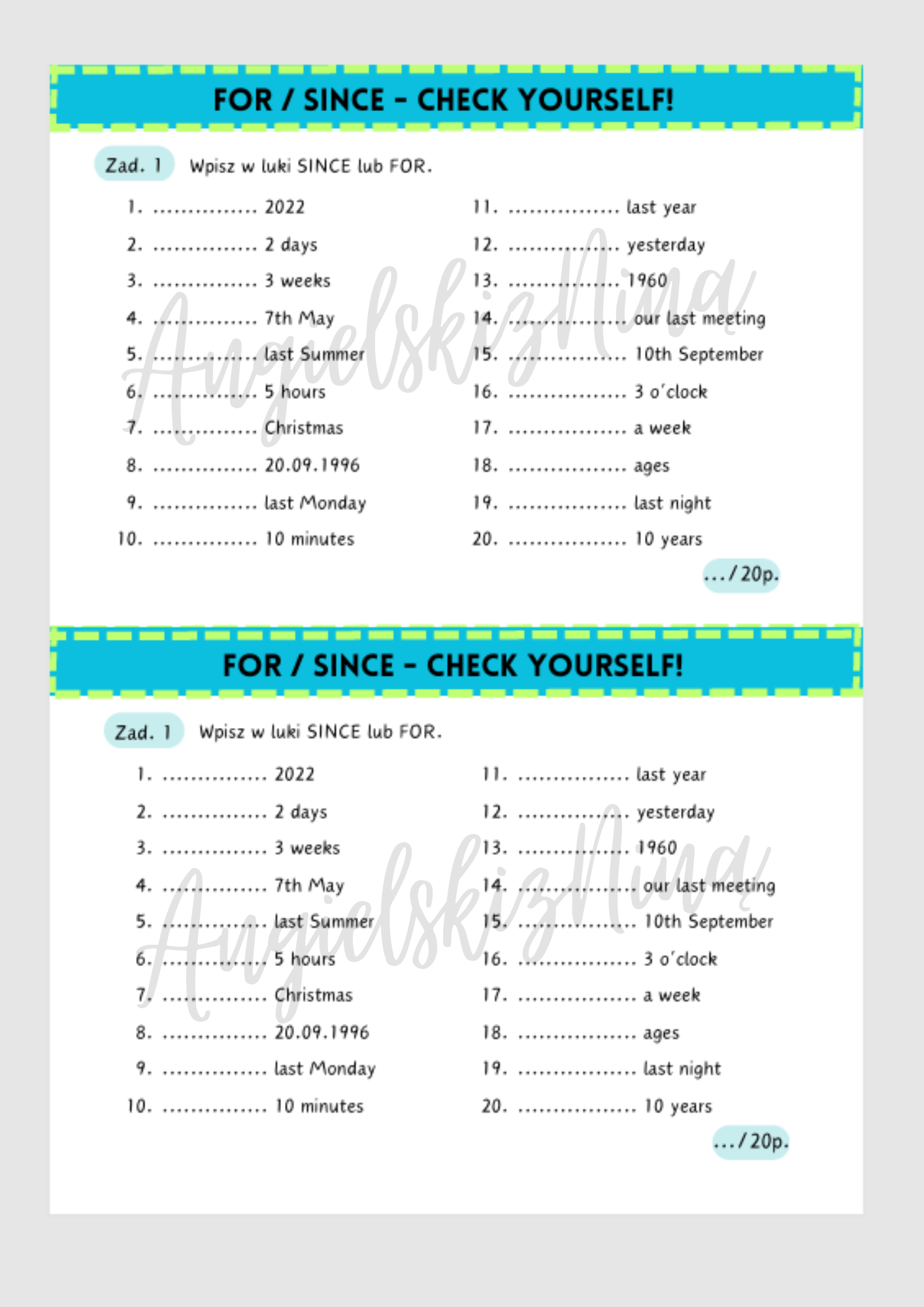 Gotowa do druku kartkówka / powtórka to szybki i skuteczny sposób na utrwalenie oraz ocenę znajomości użycia FOR / SINCE.