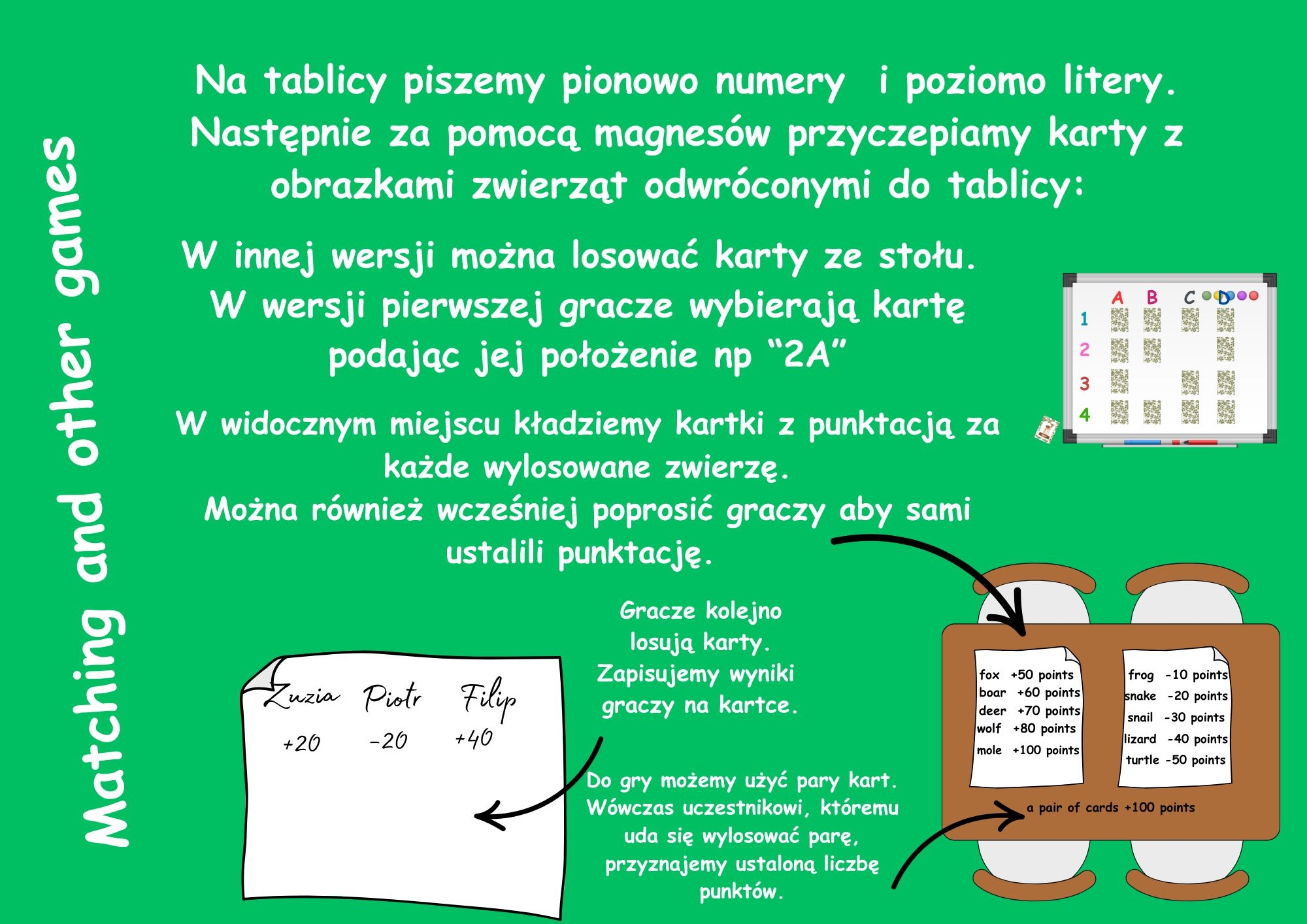 Forest Animals to praktyczny e-book edukacyjny, który zawiera karty ze zwierzętami leśnymi oraz szczegółowe opisy gier i zabaw językowych do nauki i utrwalania słownictwa w języku angielskim. Materiał został przygotowany z myślą o nauczycielach języka angielskiego pracujących w klasach 1–6 szkoły podstawowej. Każda gra w e-booku jest opisana krok po kroku, wraz z propozycjami punktacji, wariantami rozgrywki oraz wskazówkami organizacyjnymi, co pozwala na szybkie wykorzystanie materiału na lekcji. E-book zawiera karty w dwóch formatach: standardowe karty do gier stolikowych, karty w formacie A4, idealne do gier dywanowych i aktywności ruchowych z całą klasą. W e-booku znajdziesz m.in. opisy gier: Find the Animal! Memory / Matching Kaboom! Go Fish! Zabawy można łatwo dostosować do wieku i poziomu uczniów — od klas młodszych po starsze. Materiał rozwija koncentrację, refleks, współpracę oraz zachęca do aktywnego używania języka angielskiego w praktyce. Materiał idealnie sprawdzi się: na lekcjach języka angielskiego w klasach 1–6 podczas gier dywanowych i pracy ruchowej w pracy indywidualnej, w parach i w grupach Dlaczego warto? gotowe gry opisane krok po kroku karty w formacie A4 do pracy na dywanie możliwość dopasowania do różnych poziomów nauka przez zabawę i elementy rywalizacji oszczędność czasu nauczyciela materiały do druku i laminowania Forest Animals to uniwersalne narzędzie dydaktyczne, które łączy ruch, zabawę i skuteczną naukę języka angielskiego.