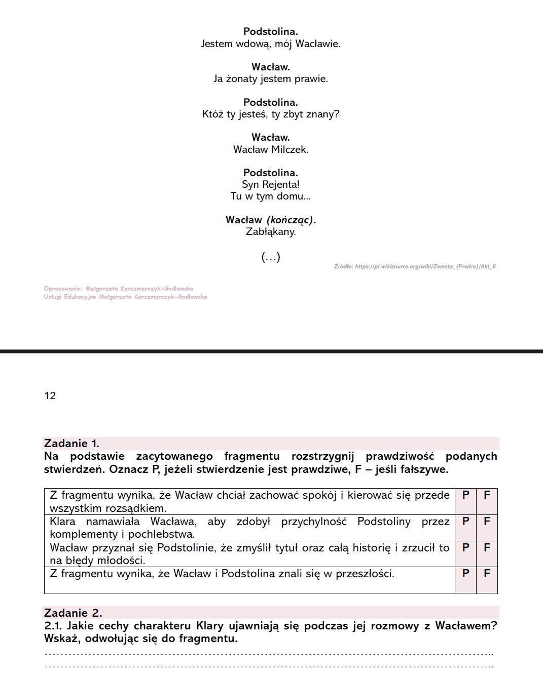 Zestaw do krytycznego (czytam i rozumiem) czytania lektur. W każdym secie: fragment lektury + zadania różnego typu do tekstu: prawda/fałsz, abcd, zadania otwarte, analiza cytatów.