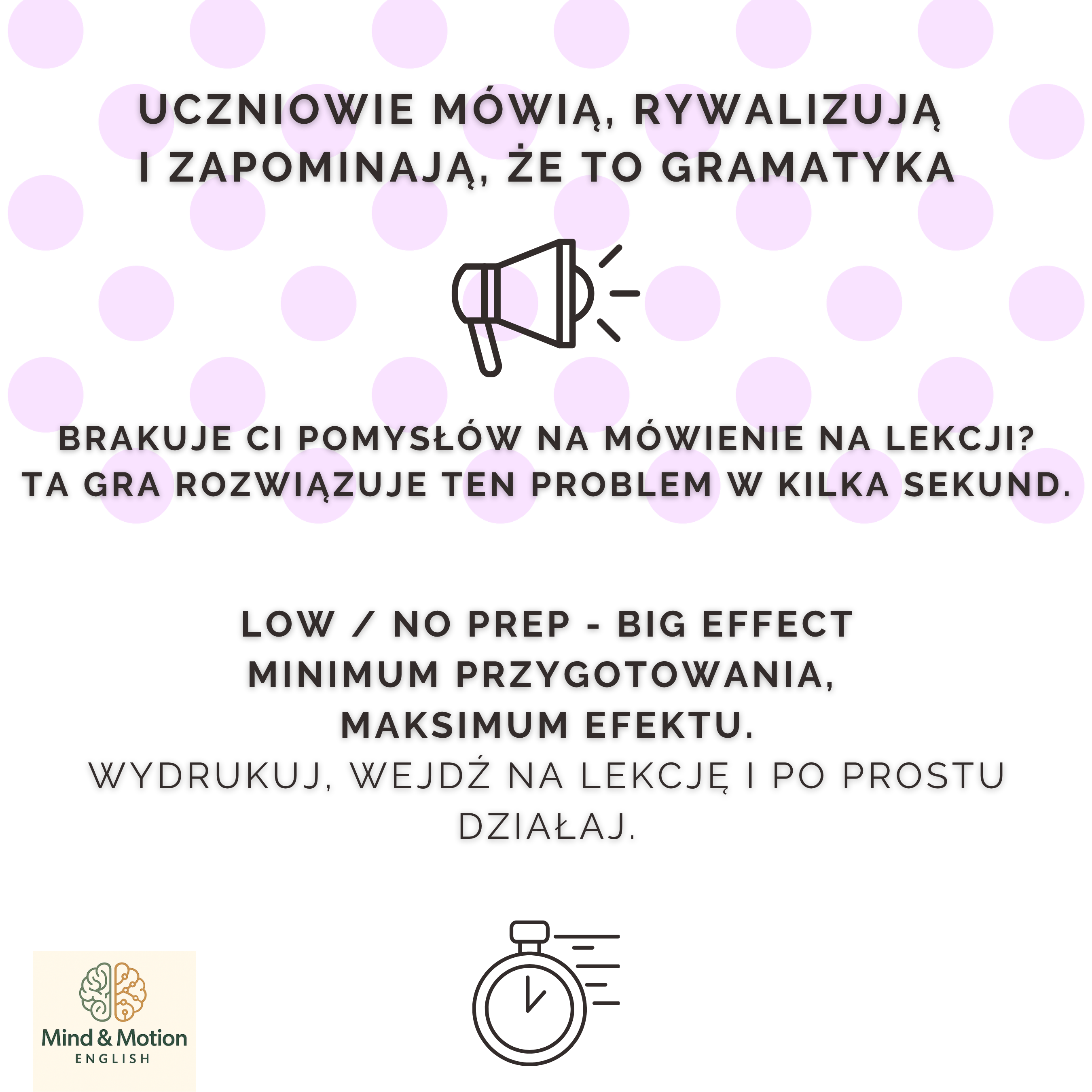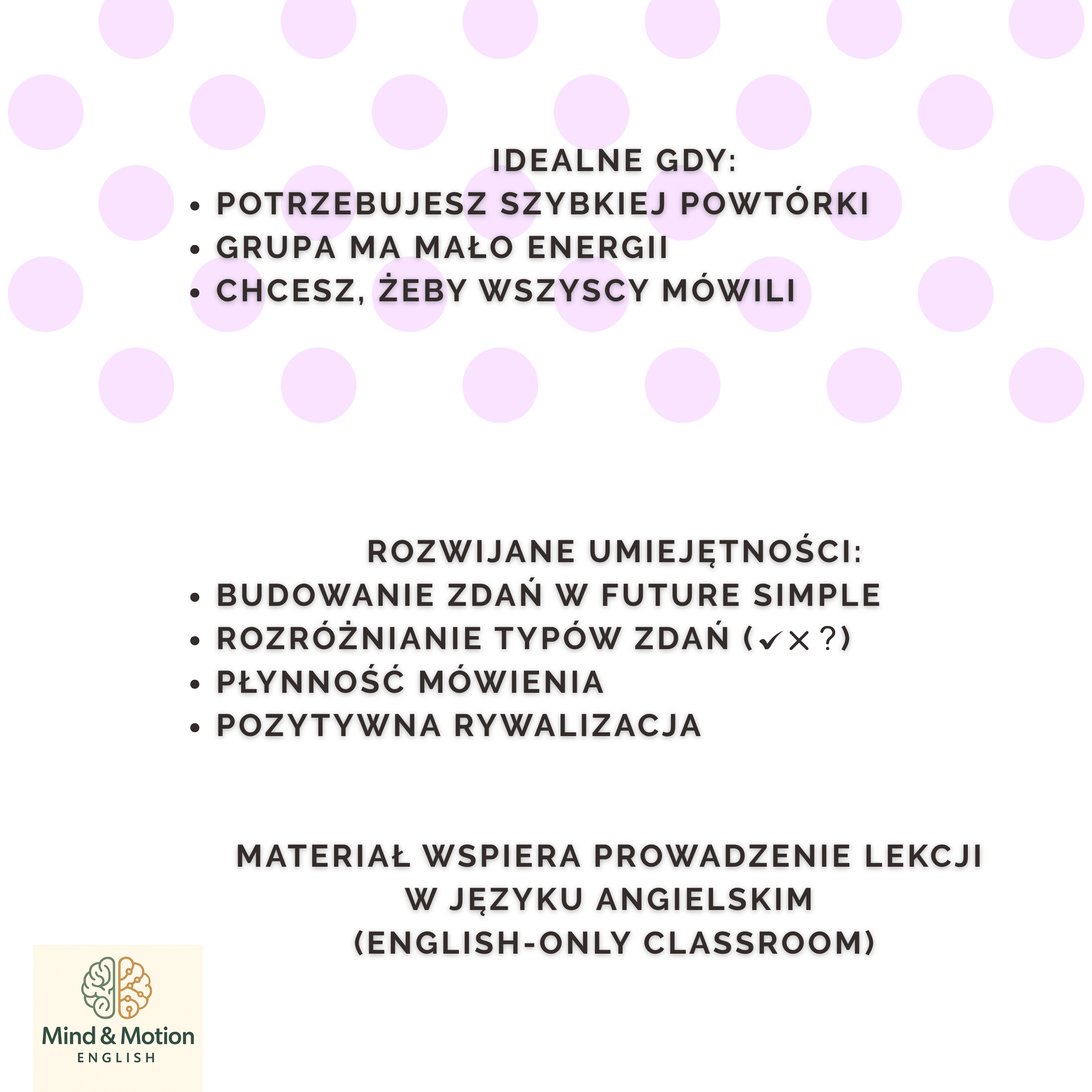 Kaboom Future Simple to prosta gra, która uruchamia mówienie w kilka minut - bez tłumaczenia, bez przygotowania, bez stresu.
