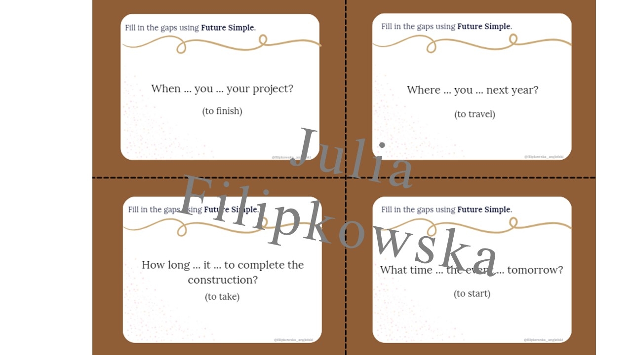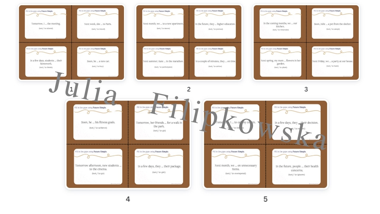 Zapraszam do zakupu materiału w języku angielskim: 60 kart do ćwiczenia Future Simple w mowie (15 stron A4). Zadanie polega na uzupełnieniu zdania brakującym (podanym) czasownikiem używając Future Simple. Materiał idealny na rozgrzewkę przypominającą gramatykę dla uczniów na początek zajęć, lub dla uczniów przygotowujących się do różnych egzaminów. Polecam karty wyciąć i zalaminować dzięki czemu wystarczą na wiele lat.