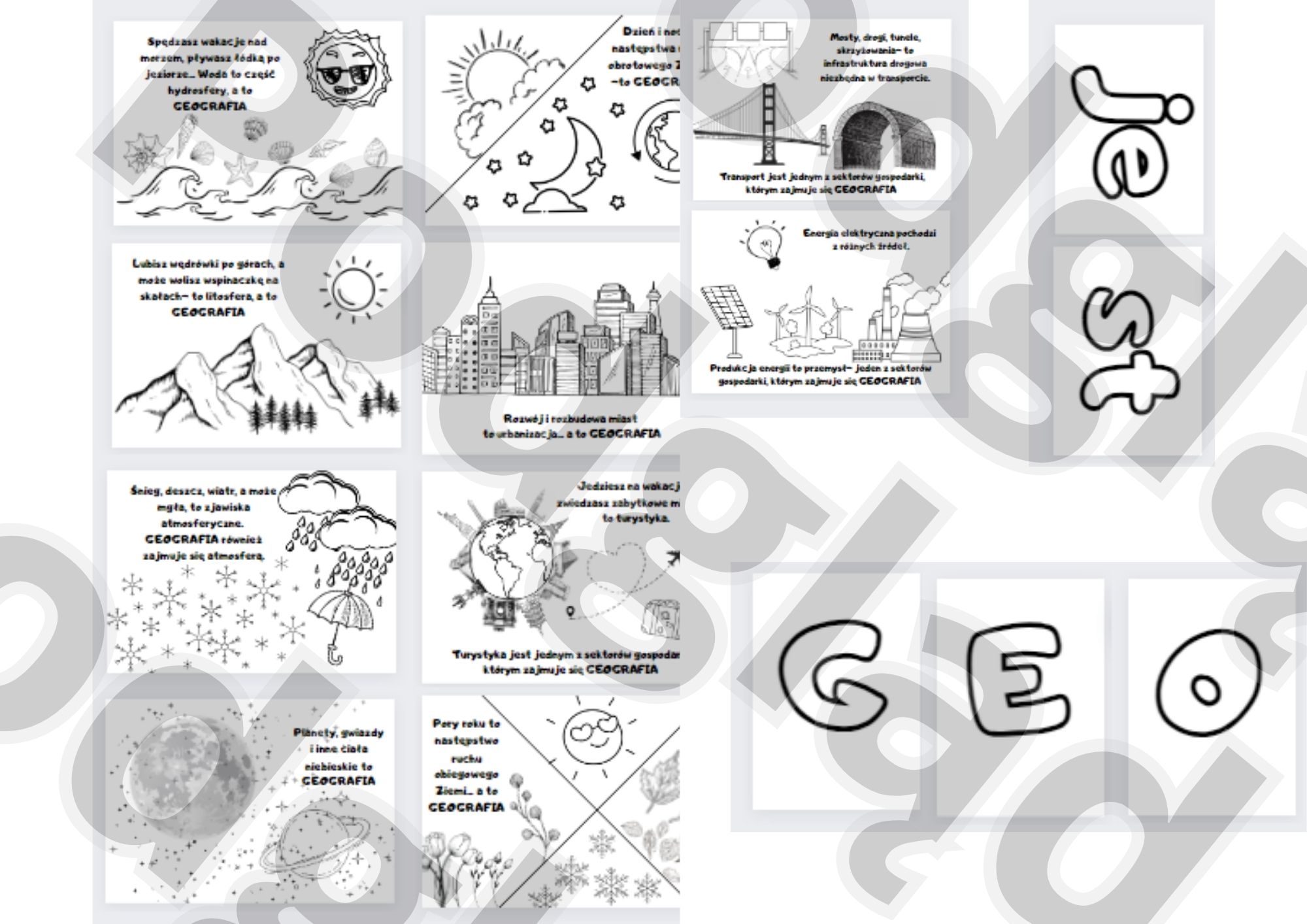 Całoroczna gazetka- Geografia. Pokazuje, że geografia nas otacza. 10 kart- gdzie jest geografia. Napis jedna literka na jednej kartce( GEOGRAFIA, WSZĘDZIE). Dokument czarno-biały, do wydruku na kolorowych kartkach