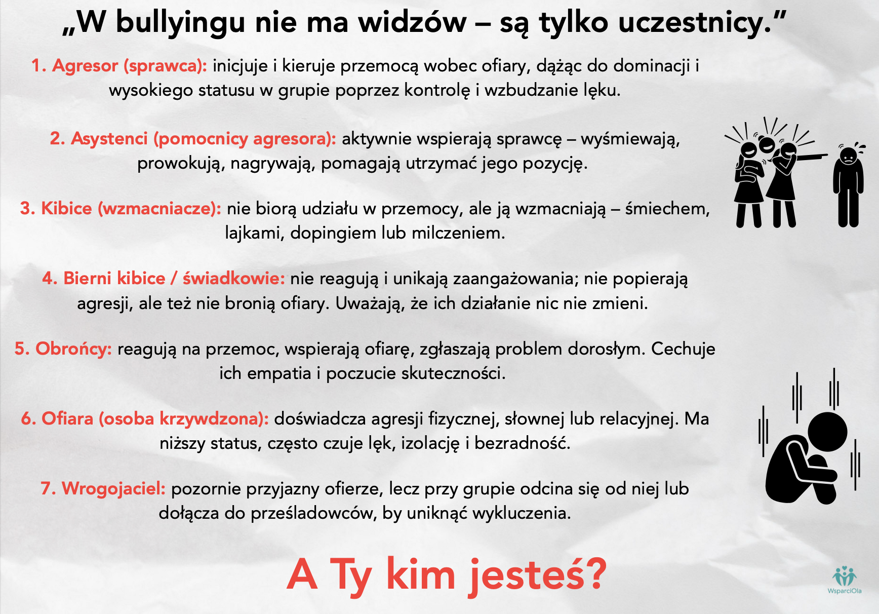 pokazuje „Koło bullyingu” – wszystkie role uczestników przemocy,