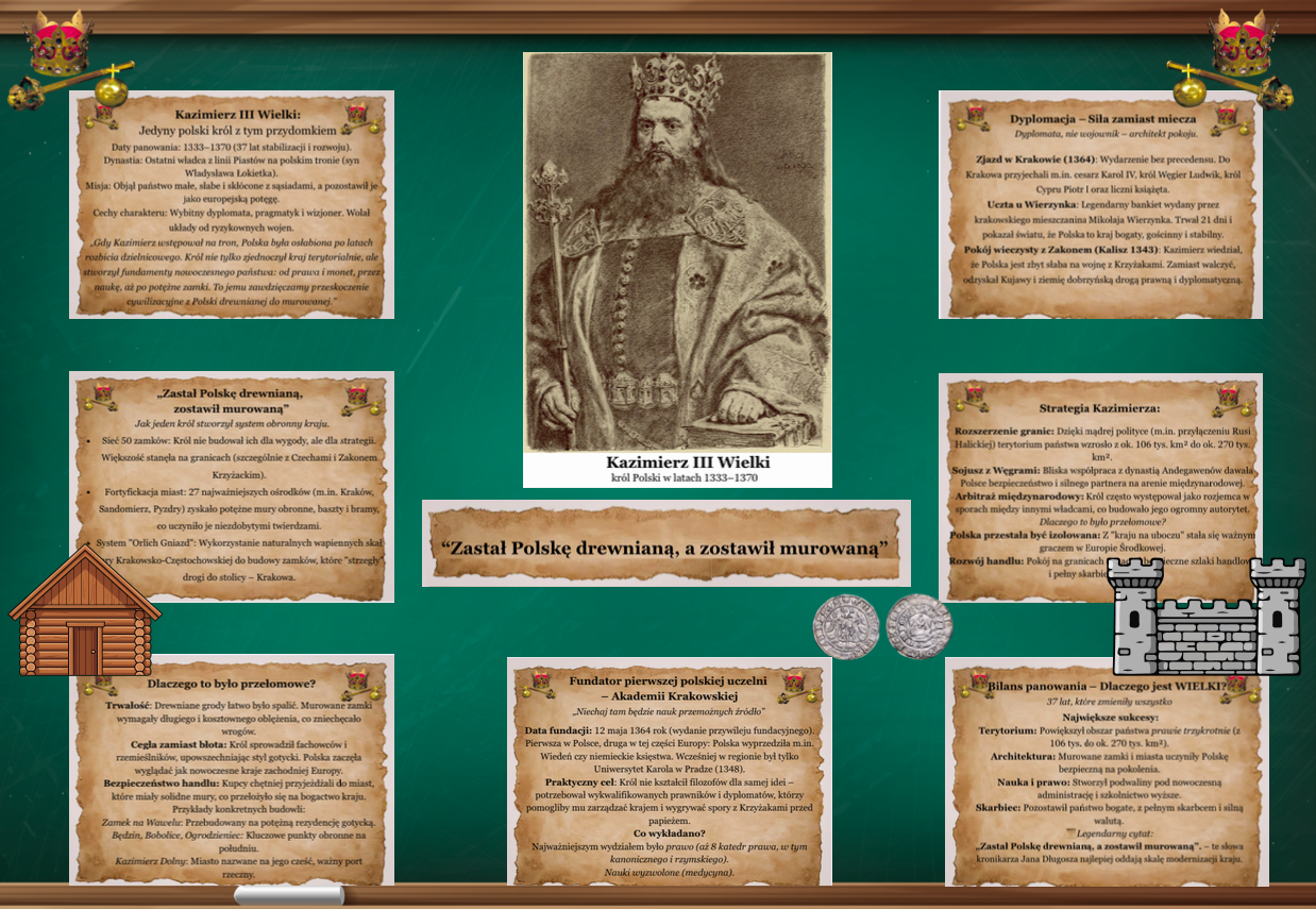 Duży plakat z wizerunkiem Kazimierza III Wielkiego w formacie 2 × A4, który przyciąga wzrok i stanowi główną część dekoracji.