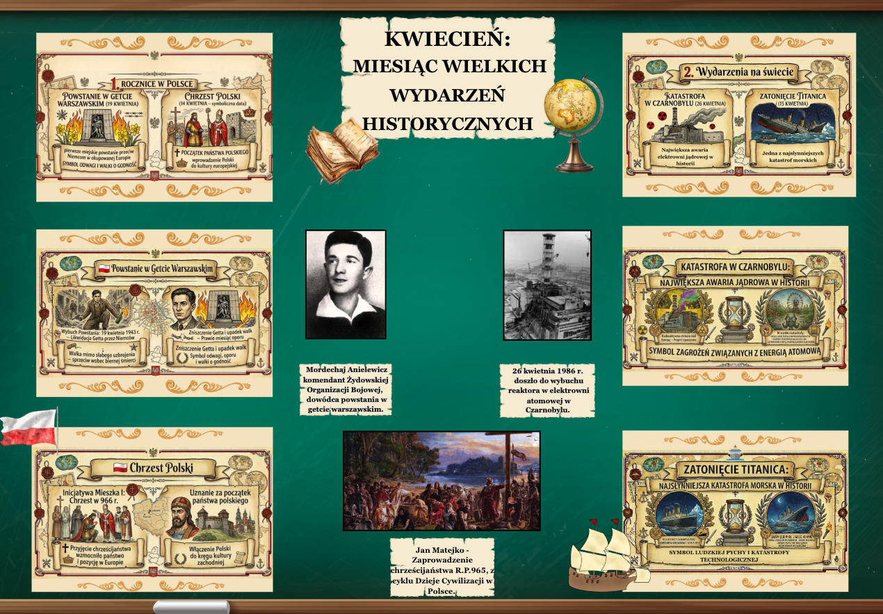 Gotowa gazetka szkolna, która w ciekawy i estetyczny sposób prezentuje najważniejsze wydarzenia historyczne związane z kwietniem. Idealna jako dekoracja klasy lub materiał edukacyjny.