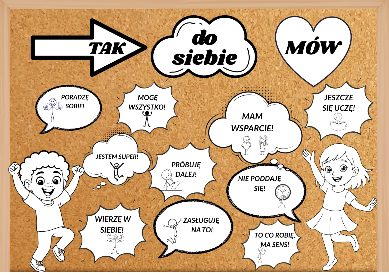 Gazetka motywacyjna „TAK do siebie MÓW” ✨ To wyjątkowy zestaw motywacyjnych plansz i plakatów, który pomaga dzieciom rozwijać pozytywne myślenie, wiarę w siebie i wytrwałość 💪. W zestawie znajduje się 10 plansz z inspirującymi napisami, które wspierają dzieci w codziennym rozwoju i zachęcają do pozytywnego dialogu wewnętrznego. Wszystkie elementy mają format A4 📄, co ułatwia ich wyeksponowanie na tablicach szkolnych, w kącikach emocji lub jako dekorację klasy. Dodatkowo zestaw zawiera duże plakaty przedstawiające chłopca i dziewczynkę (4 × A4) 👦👧, idealne do kolorowania i twórczej zabawy. Na planszach są też puste chmurki ☁️, które dzieci mogą wypełniać własnymi myślami, marzeniami lub hasłami motywacyjnymi. Motywacyjne napisy, między innymi takie jak: „Poradzę sobie!” „Mogę wszystko!” „Nie poddaję się!” „Jeszcze się uczę!” pomagają dzieciom budować pewność siebie i kształtować pozytywne nawyki myślowe. Idealna dekoracja do przedszkoli, szkół i miejsc, w których dzieci uczą się nie tylko przedmiotów, ale także jak być dla siebie dobrym i wytrwałym 🌟.