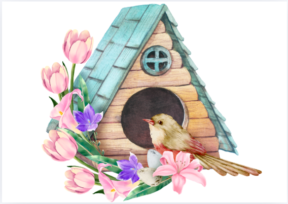Dodatki dekoracyjne: Kolorowe motyle, ptaszki na gałązkach oraz urocza budka lęgowa, które dopełniają całą scenę.