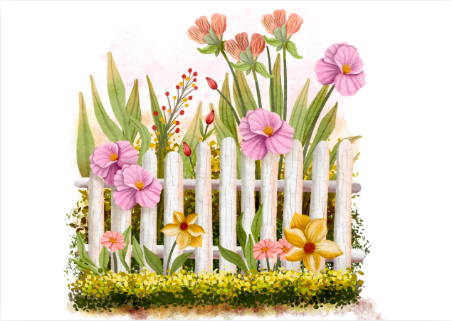 Biały Płotek (Elementy XXL): Dekoracyjny płotek z kwiatami, również przygotowany w formacie 4 x A4, idealny do wyklejenia dolnej części gazetki.