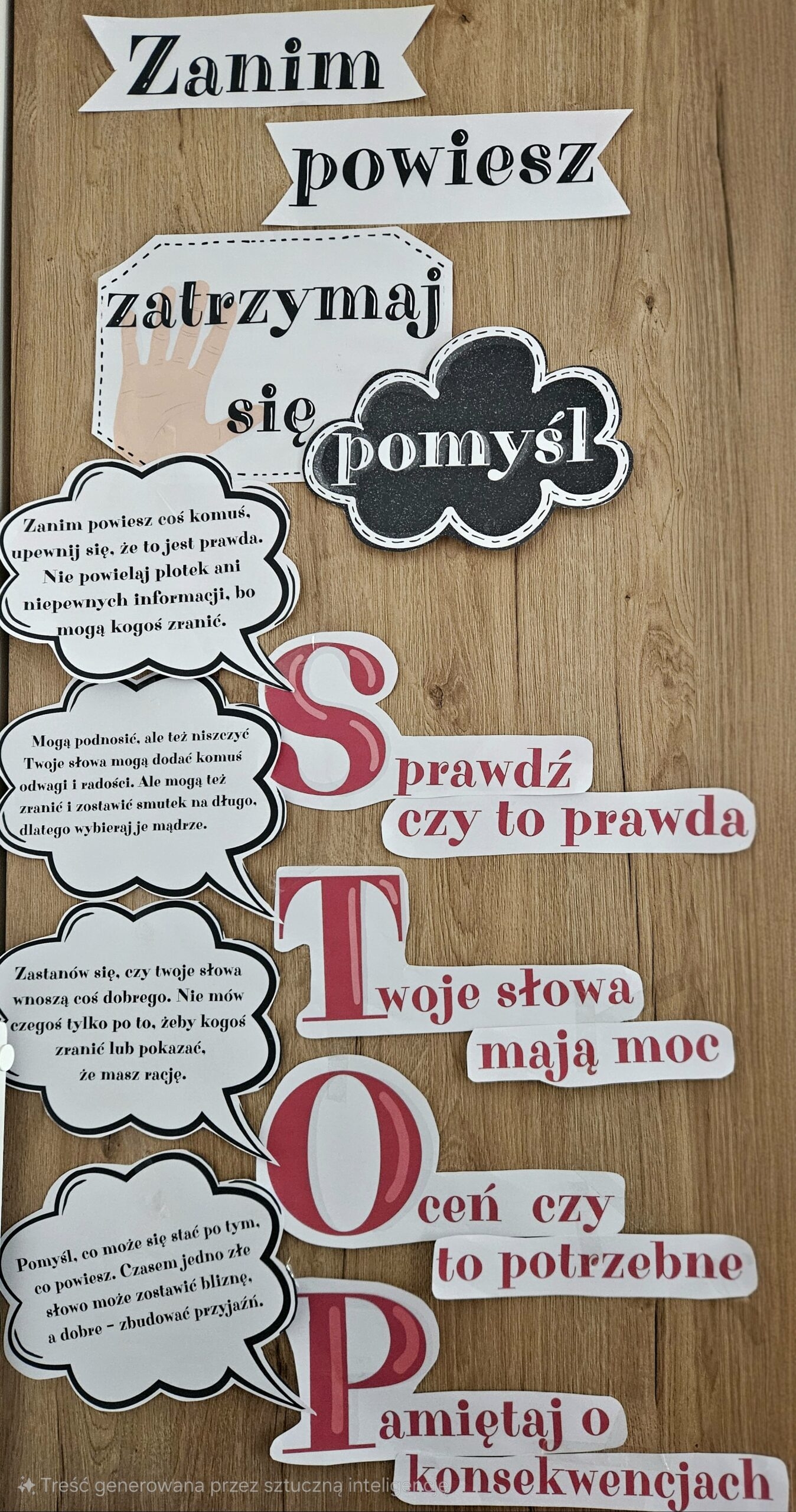 Gazetka szkolna dla uczniów w każdym wieku. Gazetkę można użyć jako całoroczne przypomnienie o tym, żeby uważać na słowa które wypowiadamy do kolegi/koleżanki i zastanowić się nad 4 ważnymi rzeczami.