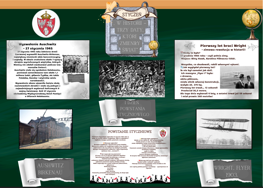 Centralnym punktem gazetki jest duży plakat z nagłówkiem „Styczeń w historii — trzy daty, które zmieniły świat”, ułożony z 4 połączonych arkuszy A4, dzięki czemu wygląda jak duży, profesjonalny baner i od razu przyciąga wzrok.