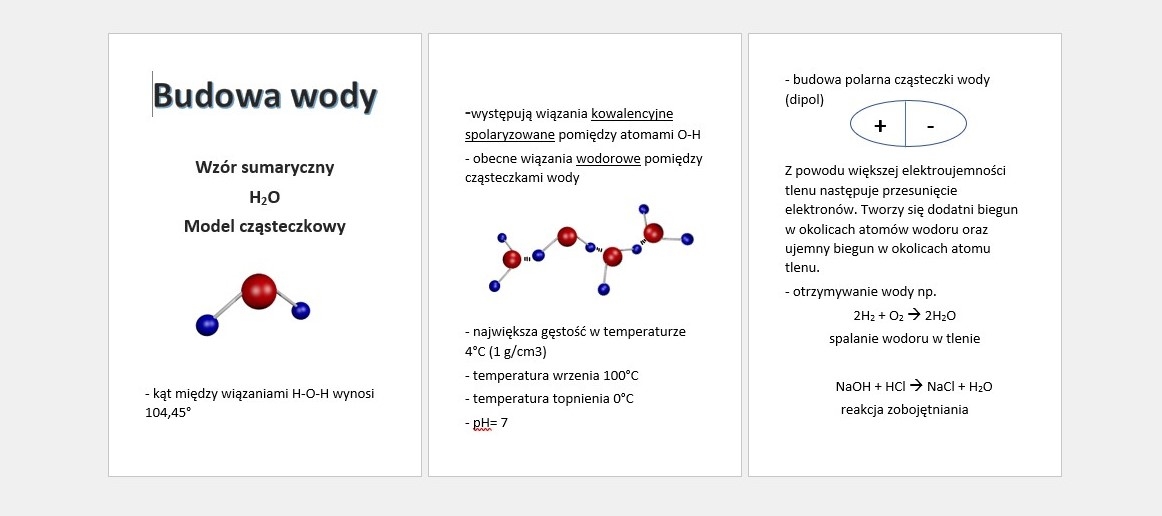 Materiały gotowe do wydruku zawierające informacje o śladzie wodnym w produkcji, obieg wody w przyrodzie, podział wody na słodką i słoną, podstawowe informacje chemiczne dotyczące budowy wody, schemat przemiany wody. Dodatkowo dostępny napis oraz gotowe do druku krople wody.