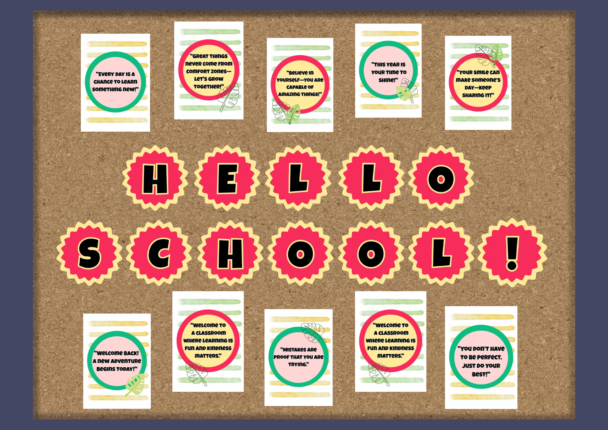 motywacyjne cytaty oraz powitalny napis w języku angielskim. Idealne na pierwszą szkolną gazetkę.