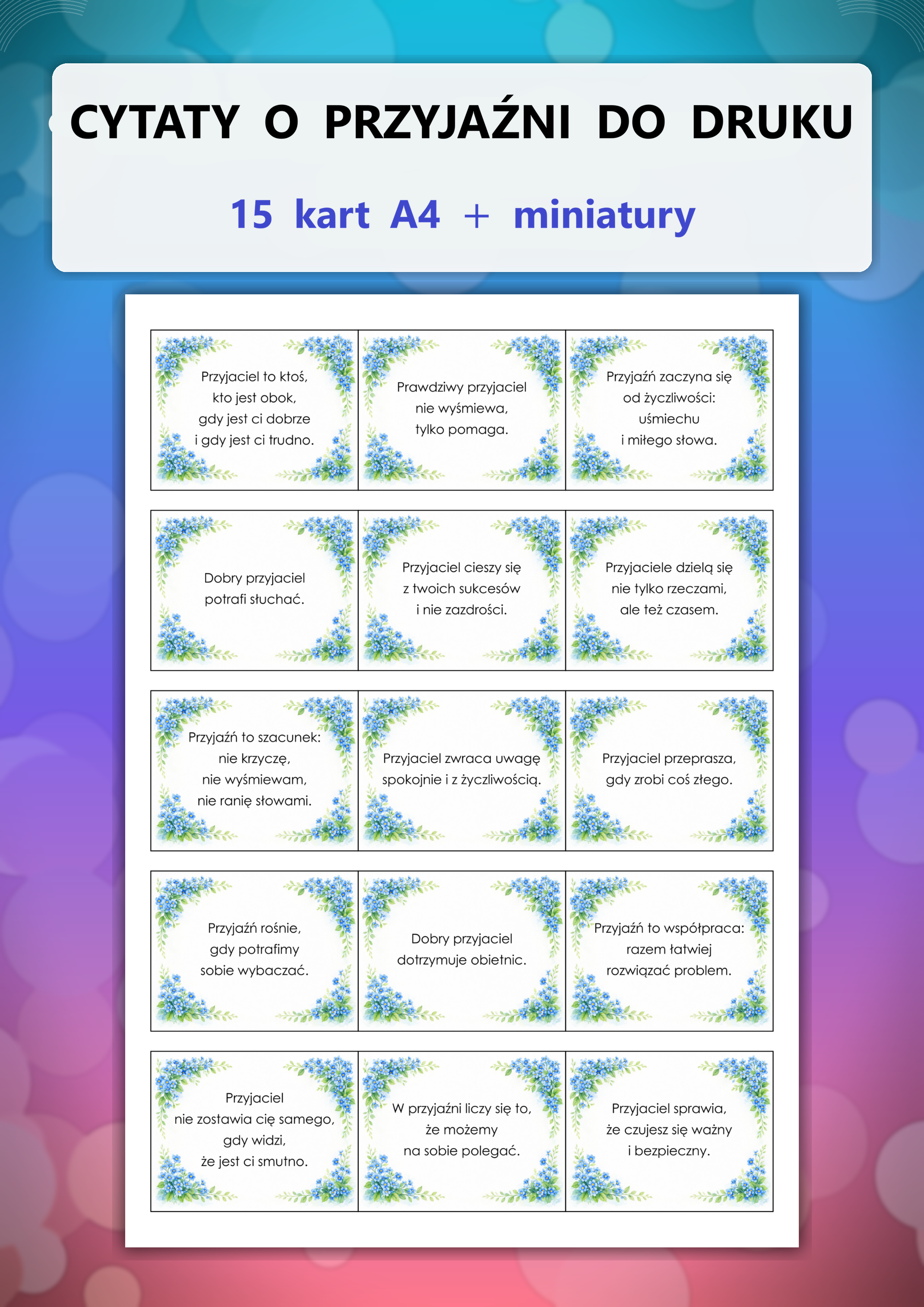 Cytaty o przyjaźni do druku w formacie A4. Zestaw zawiera 15 estetycznych kart A4 z cytatami o przyjaźni w ozdobnych ramkach (motyw niezapominajek) oraz 1 kartę A4 z miniaturami tych samych sentencji - idealną do szybkich aktywności i pracy w grupach.