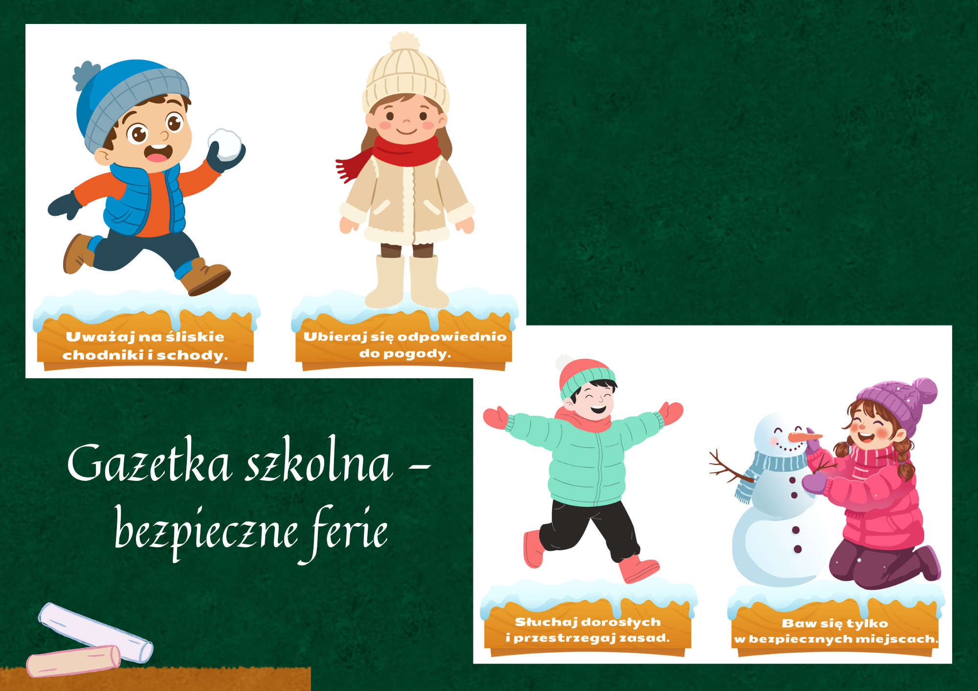 Kolorowe ilustracje oraz krótkie, zrozumiałe hasła pomagają uczniom zapamiętać podstawowe zasady bezpieczeństwa podczas zimowego wypoczynku.