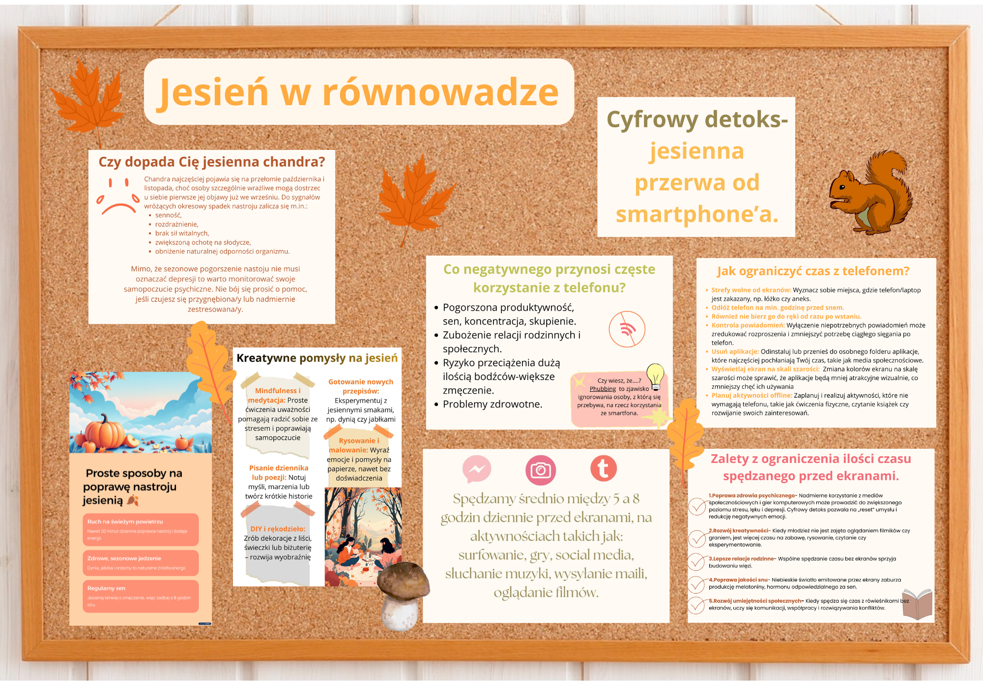 Propozycja materiałów na gazetkę ścienną w temacie dobrostanu w okresie jesienno-zimowym, a w tym higiena cyfrowa. Zawiera: plansze informacyjne, nagłówki, elementy dekoracyjne do wycięcia.