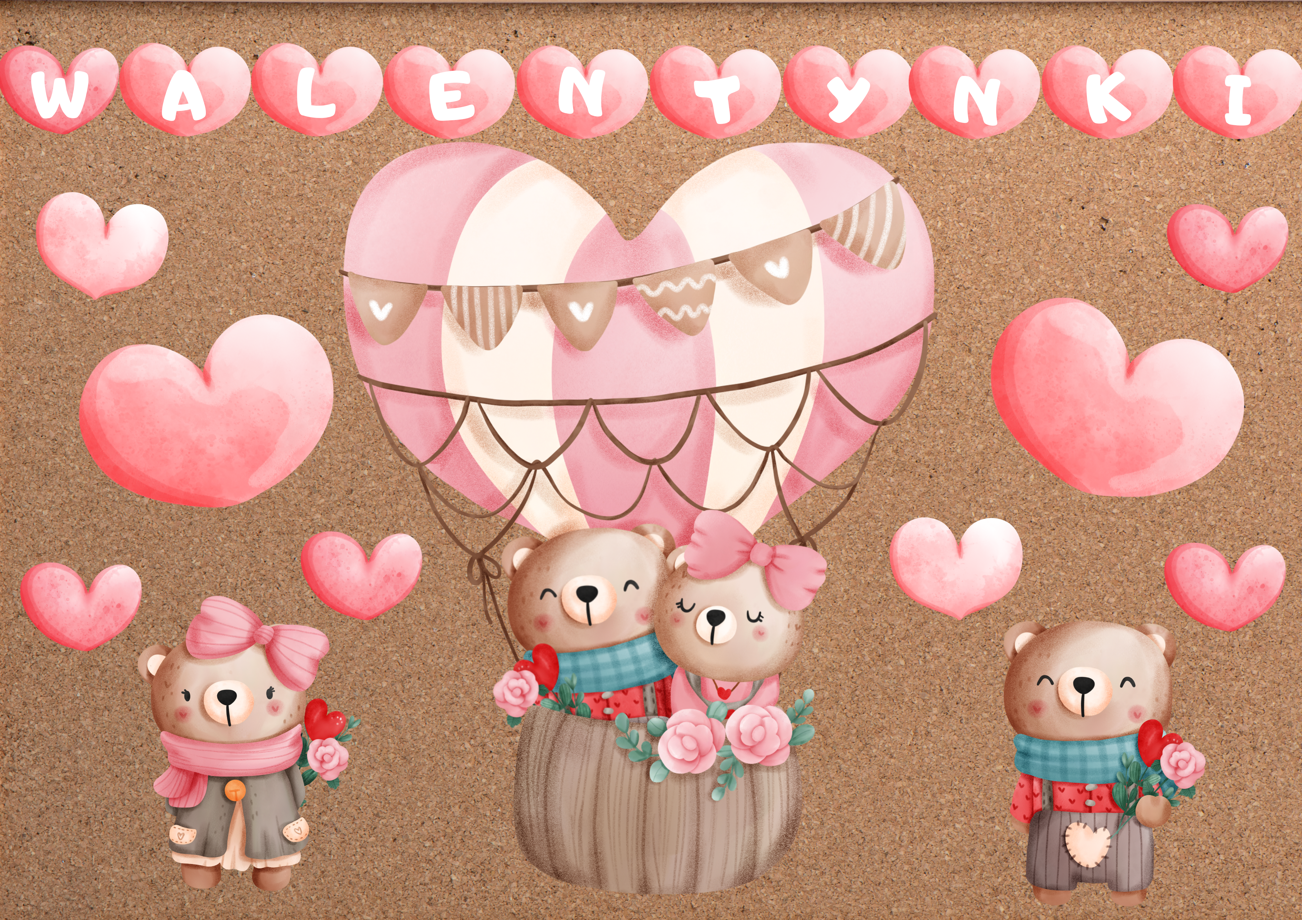 Materiały na gazetkę- napis w sercach - każde na A4- balon - podzielony na 9 kartek A4 i 16 kartek A4- misie - podzielone na 4 kartki A4- serca - iA4 i 2xA4