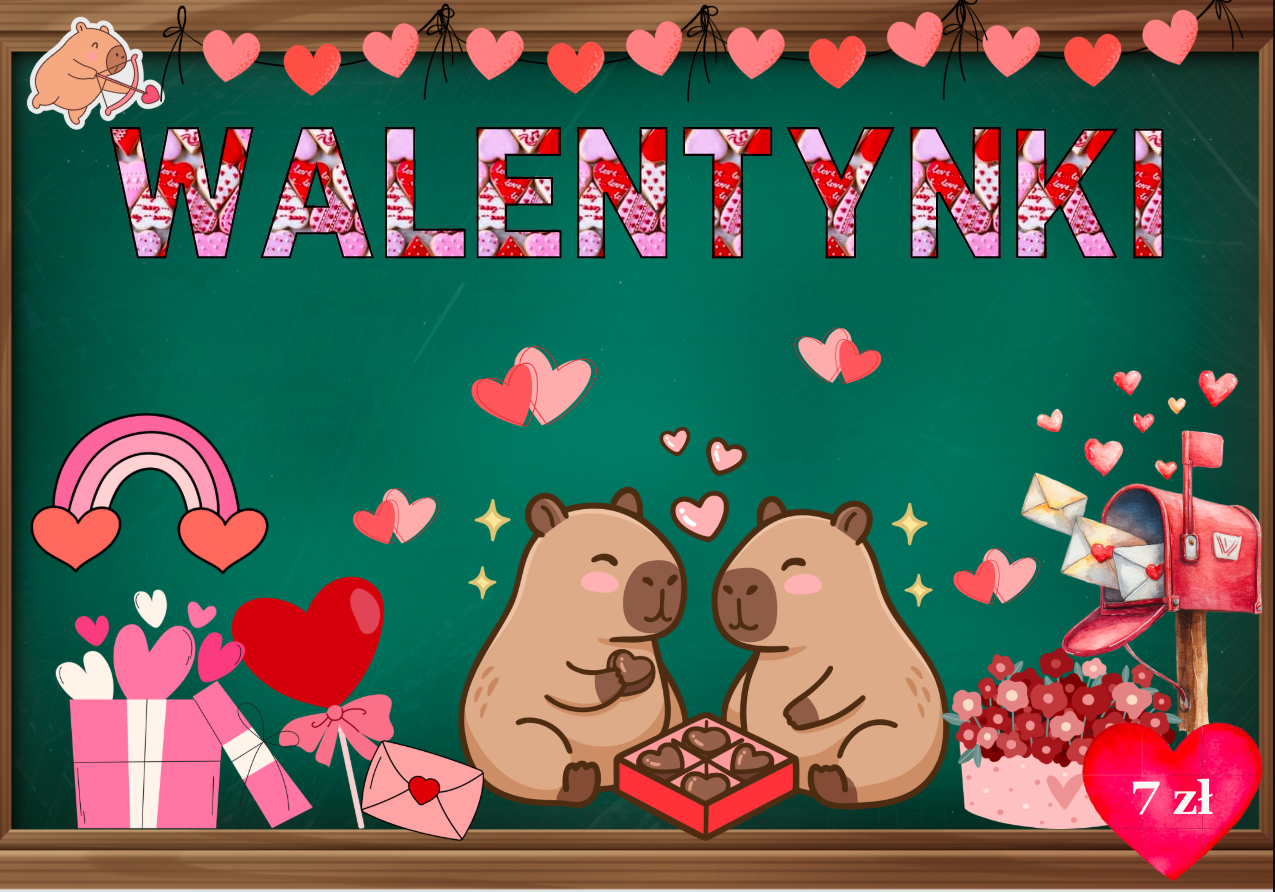 Gazetka dekoracyjna "Zakochane Kapibary" na WALENTYNKI 💗 Uroczy zestaw walentynkowych dekoracji w dziecięcym, ciepłym stylu. Idealny do stworzenia efektownej gazetki lub dekoracji sali w przedszkolu i szkole. Zawartość zestawu: Zakochane kapibary – plakat XXL (4 × A4) Napis „WALENTYNKI” – litery w formacie A4 Walentynkowe grafiki: serduszka, prezenty, listy, girlandy Pozostałe elementy w formacie A4 oraz mniejszym Zastosowanie: gazetka szkolna i przedszkolna dekoracja sali, tablicy lub korytarza walentynkowy kącik tematyczny Zestaw pozwala szybko i łatwo przygotować spójną, walentynkową aranżację bez dodatkowych materiałów 💕