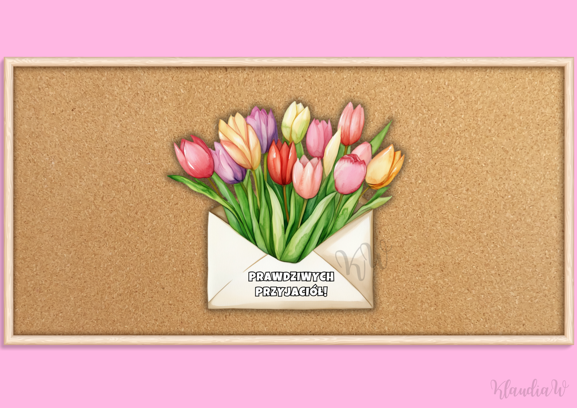 9 kopert (A4) z kolorowymi tulipanami i życzeniami,