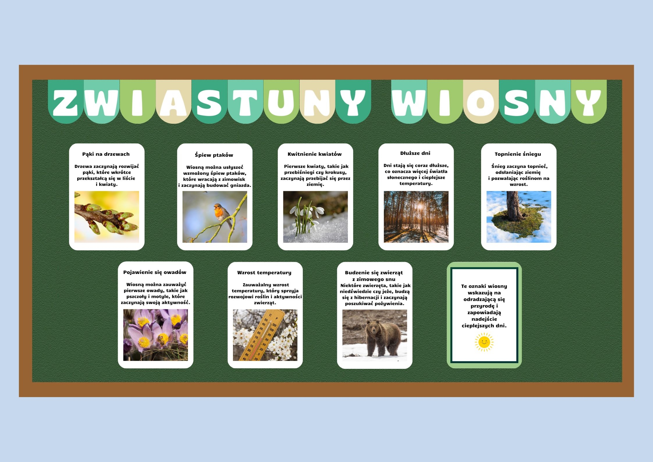 Gazetka zawiera przygotowany do druku napis: "Zwiastuny wiosny" oraz 9 plansz ze zdjęciami, które w krótkiej formie przedstawiają oznaki zbliżającej wiosny. Plik w .pdf.