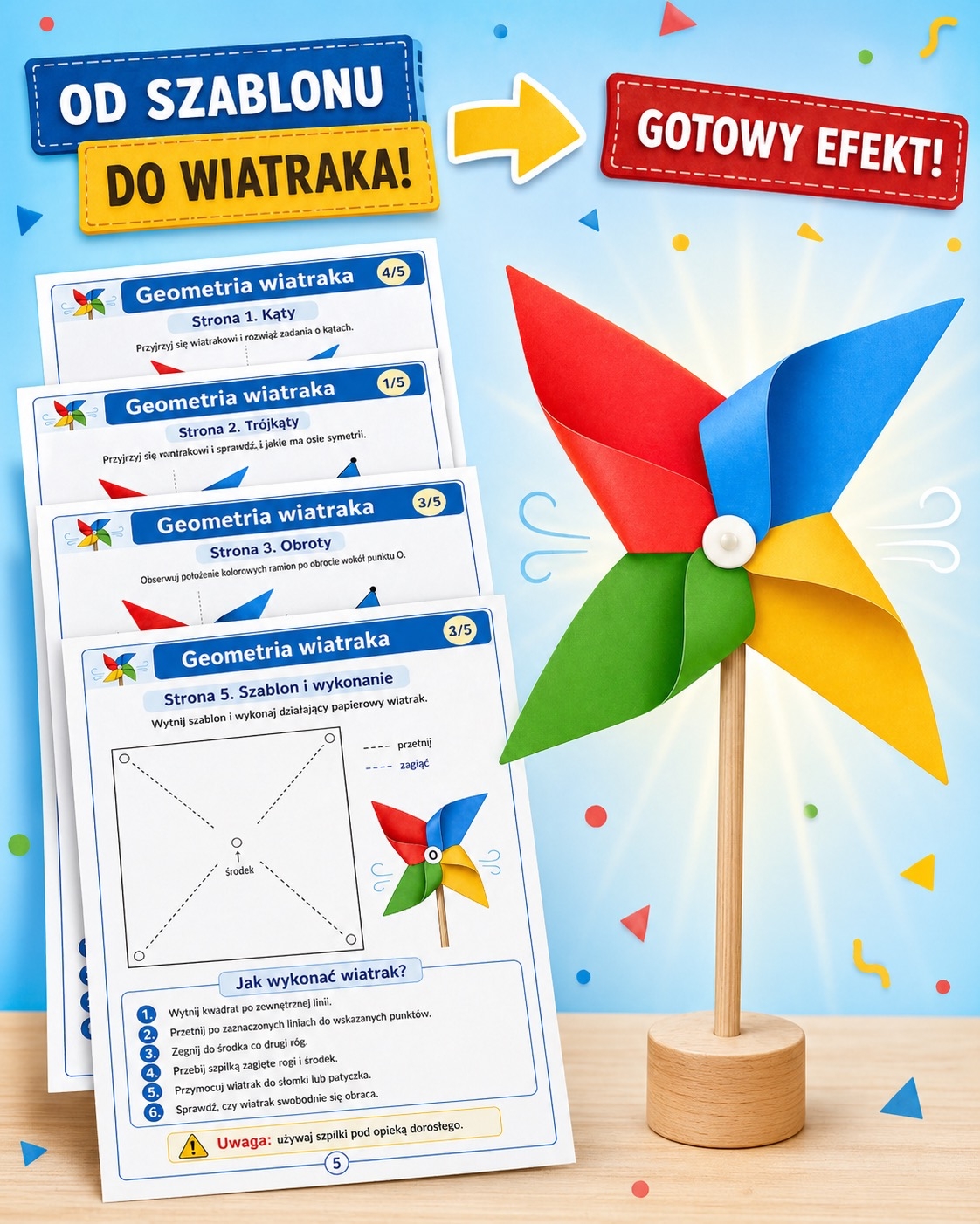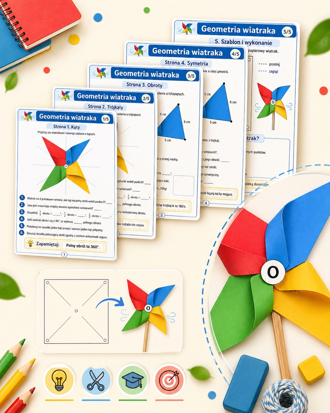 To świetny materiał na lekcję matematyki, zajęcia kreatywne, powtórkę z geometrii albo aktywność łączącą naukę z działaniem. Dzieci nie tylko rozwiązują zadania, ale też tworzą własny wiatrak, obserwując geometrię w praktyce. 😊