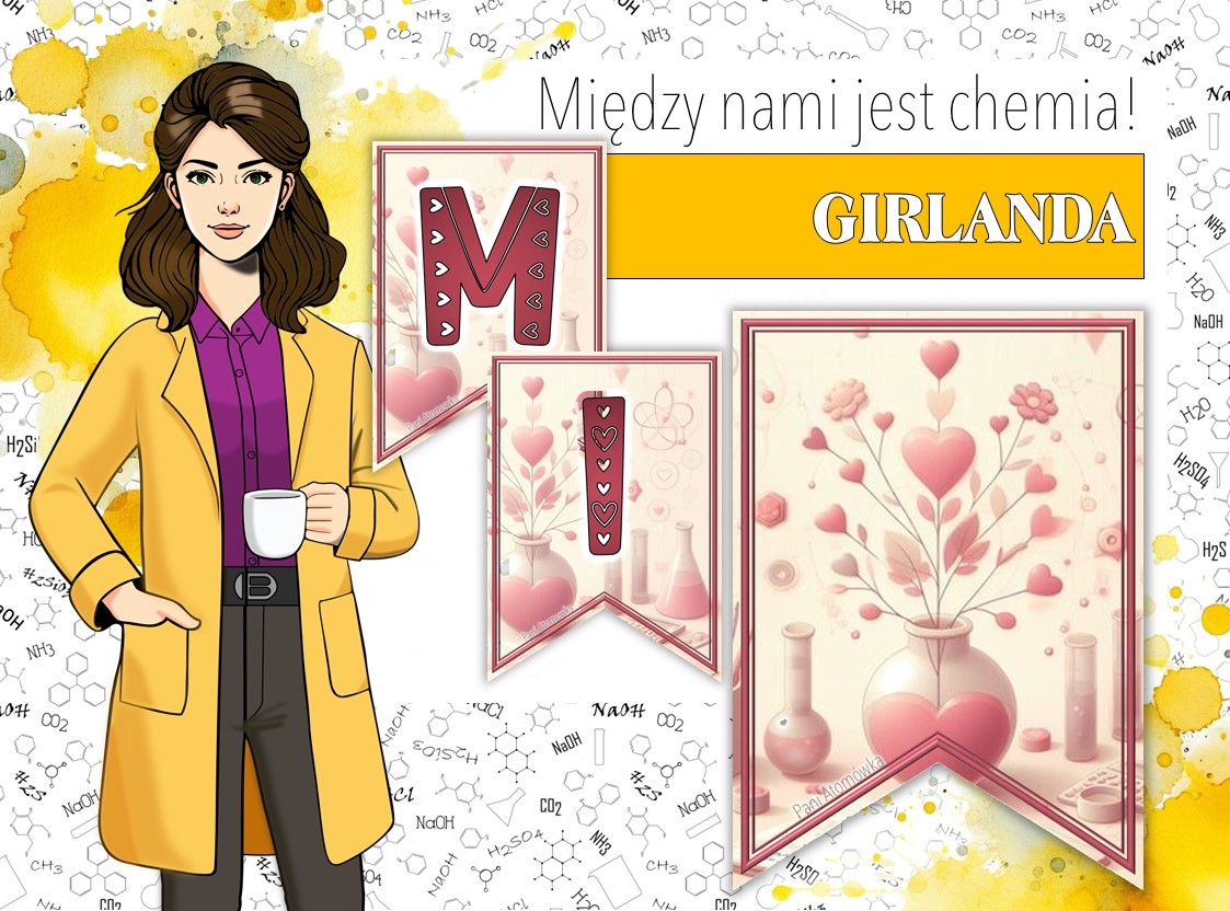 Gotowa do wydruku girlanda "MIĘDZY NAMI JEST CHEMIA" to idealna dekoracja, która ożywi szkolną przestrzeń.
