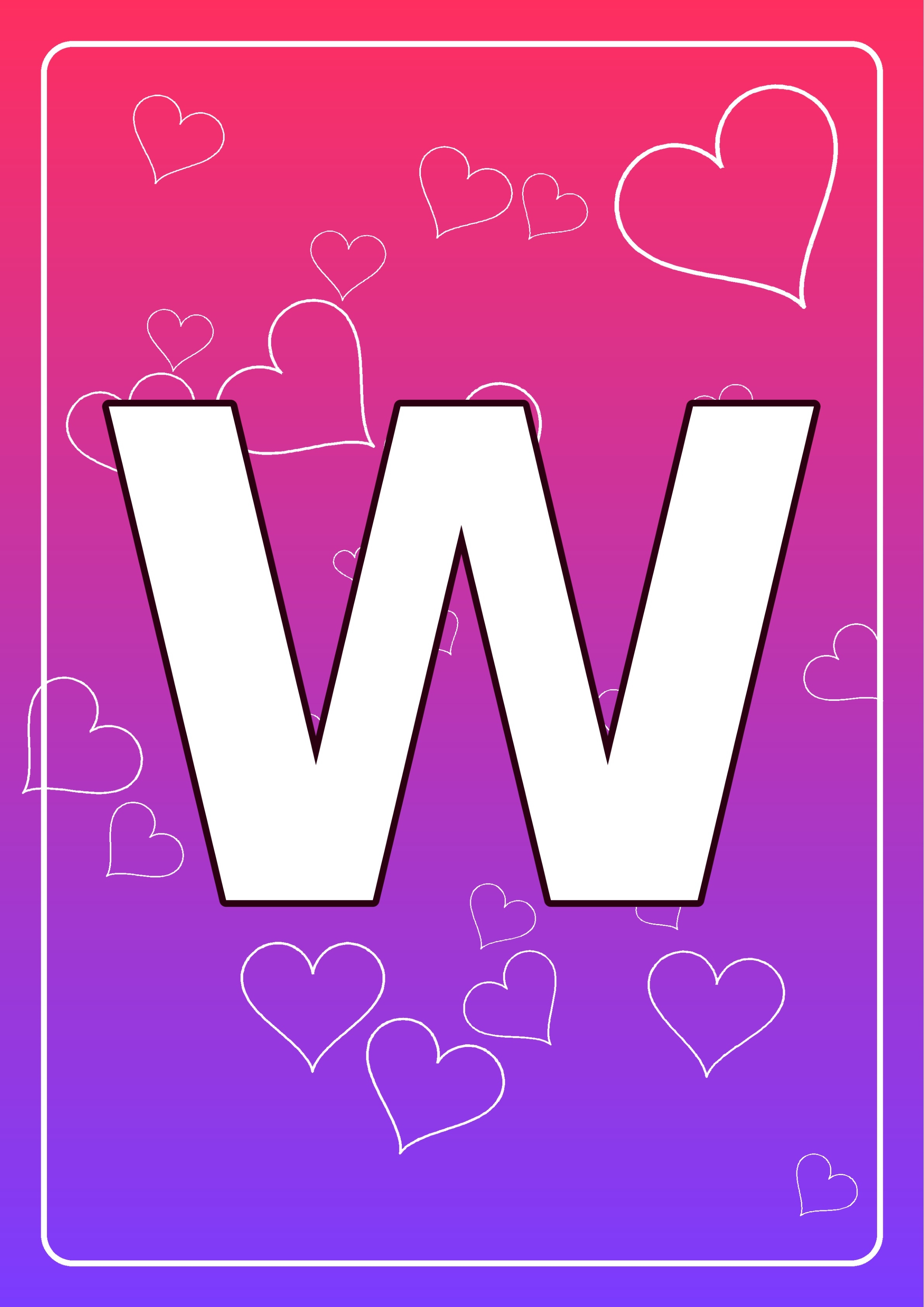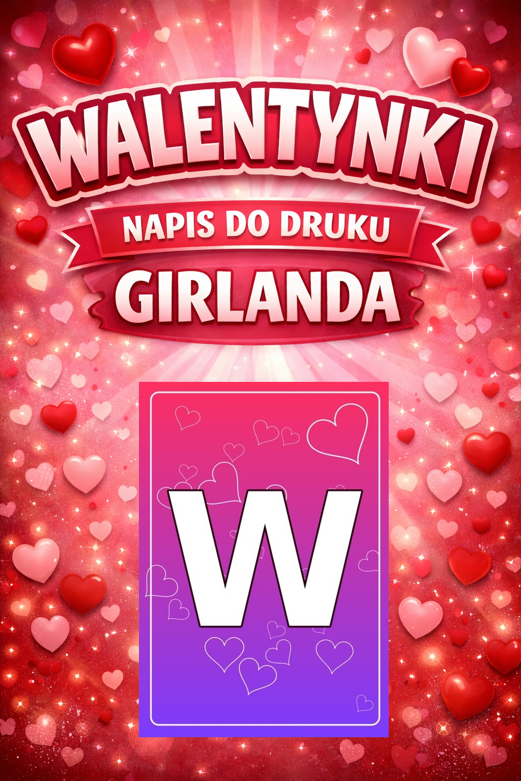 Plik zawiera gotowy napis do girlandy „WALENTYNKI” do druku w formacie A4. Każda strona to jedna duża litera na walentynkowym tle z serduszkami. Wydrukuj, wytnij i złóż w baner/girlandę.