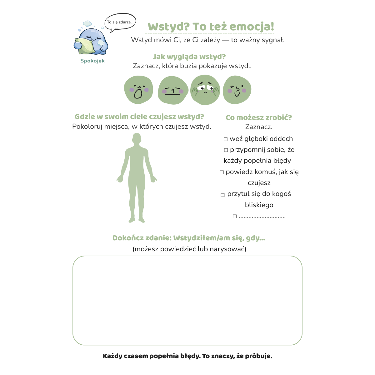 Zawartość pakietu: 5 stron PDF do druku | karta o wstydzie z ćwiczeniem "gdzie czujesz wstyd w ciele" | karta o frustracji z mini zadaniem | karta o dumie — jak okazujesz dumę innym | karta o odwadze z zadaniem do wykonania dziś | strona podsumowująca z wyborem emocji dnia i dokończ zdania