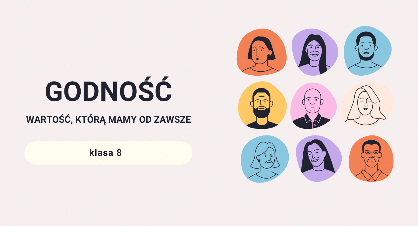 Cel lekcji: uświadomienie sobie, że godność jest wartością uniwersalną, ponadczasową, powszechną i niezbywalną, odróżnienie jej od zmiennego poczucia własnej wartości, zapoznanie się ze źródłami pojęcia godności