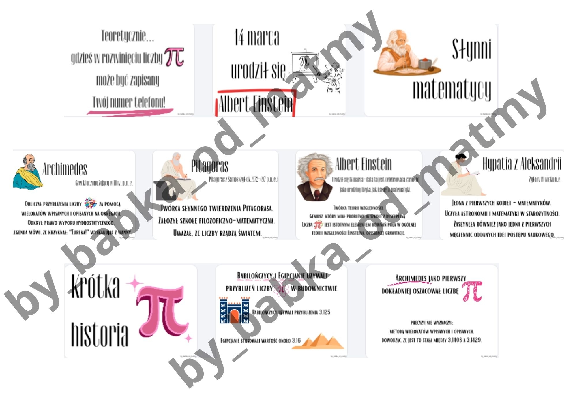 4 słynnych matematyków przedstawionych w przystępnej formie: Archimedes, Pitagoras, Albert Einstein, Hypatia z Aleksandrii (jedna z pierwszych kobiet - matematyków)