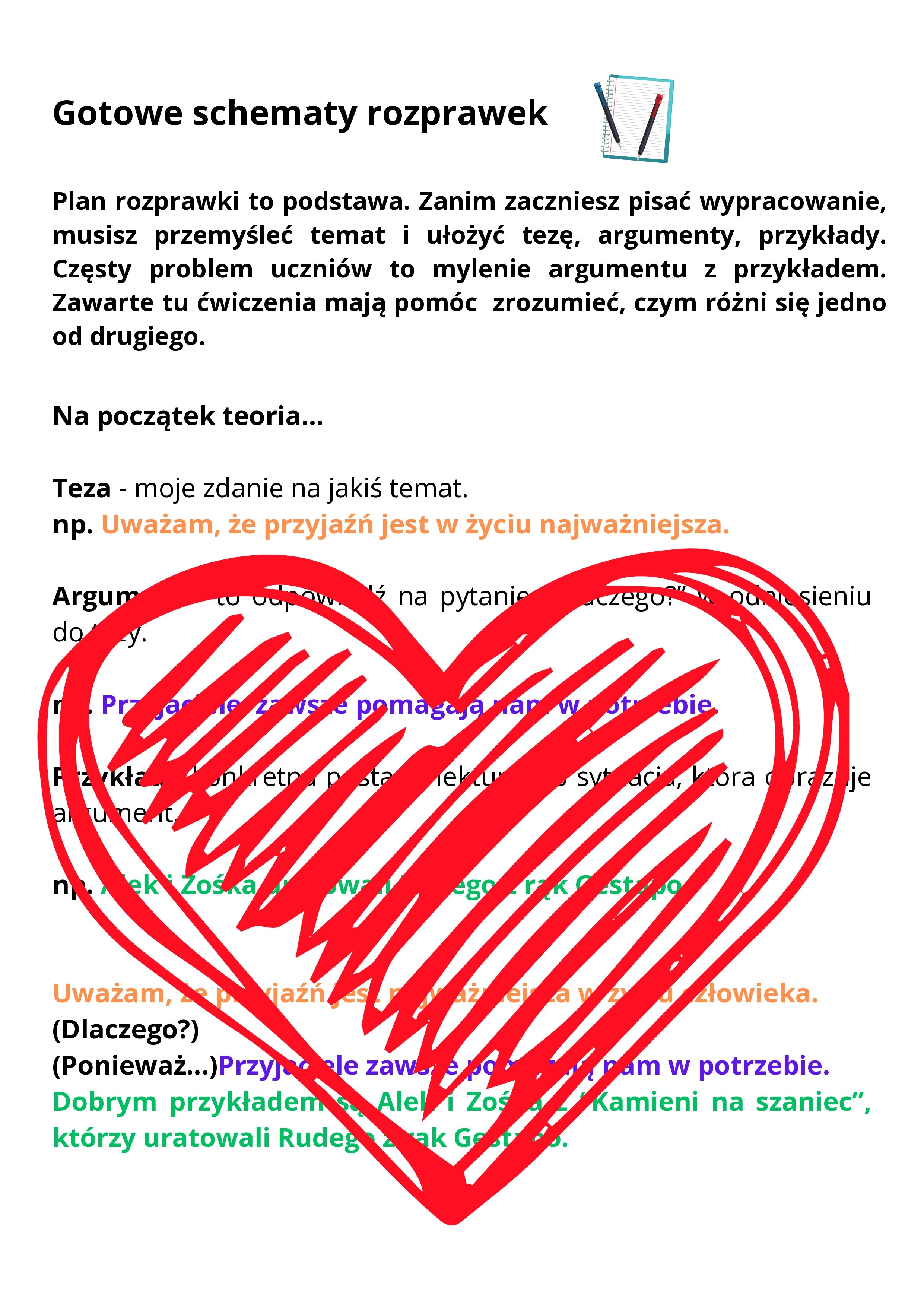Plan rozprawki to połowa sukcesu. Poniższy materiał zawiera 11 stron, a na nich 10 tematów, które dotyczą popularnych motywów literackich (miłość, wina i kara, autorytet, tradycja, młodość, itd.). Każdy z tematów jest rozpisany na: tezę i trzy argumenty wraz z proponowanymi przykładami. Oprócz gotowych schematów rozprawek, wklejam czyste schematy do uzupełnienia przez uczniów. Można je wykorzystać na lekcjach do wspólnego uzupełnienia, do pracy w grupach lub jako kartkówkę. W dalszej kolejności schematy te służą oczywiście do pisania pełnych rozprawek. U mnie świetnie sprawdza się ten rodzaj pracy. Po takich ćwiczeniach uczniowie rozumieją budowę rozprawki i potrafią rozróżnić argument od przykładu.