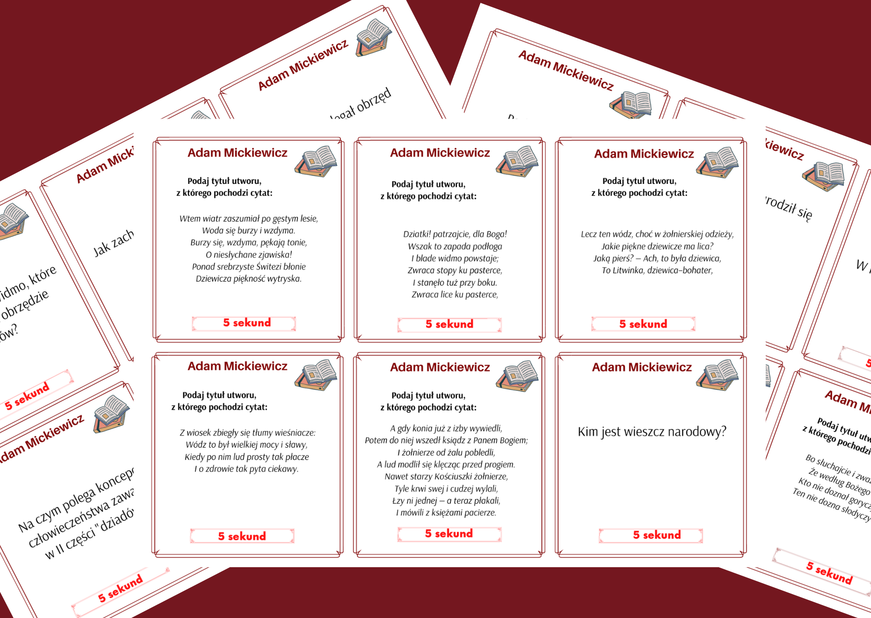Zestaw 13 kart (format A4 pdf) z 78 karteczkami do gry „5 sekund”, zawierającymi pytania dotyczące życia i twórczości A. Mickiewicza. Dotyczy treści, motywów literackich oraz cytatów z lektur obowiązkowych z klas 7-8: "Reduta Ordona", "Śmierć Pułkownika", "Dziady cz. II", "Świtezianka", "Sonety krymskie".