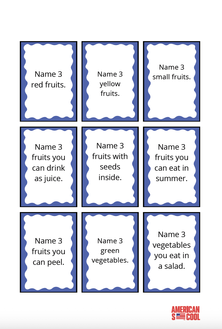 Ponad 45 prostych kart do gry w języku angielskim dla dzieci. Uczniowie mają tylko 5 sekund, żeby wymienić trzy rzeczy z danej kategorii (owoce, warzywa, desery, napoje, jedzenie).