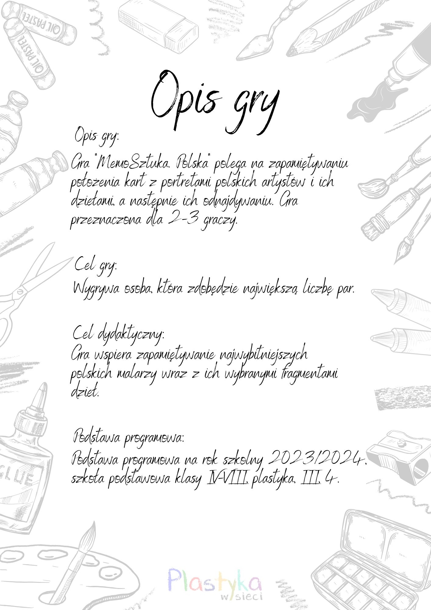 Gra wspiera zapamiętywanie najwybitniejszych polskich malarzy wraz z ich wybranymi fragmentami dzieł.