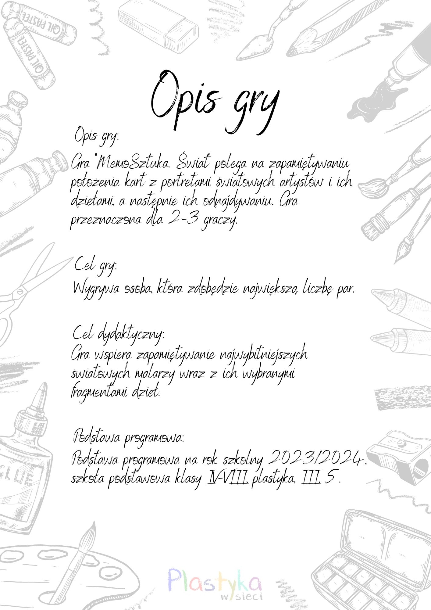 Gra "MemoSztuka. Świat" polega na zapamiętywaniu położenia kart z portretami światowych artystów i ich dziełami, a następnie ich odnajdywaniu. Gra przeznaczona dla 2-3 graczy.