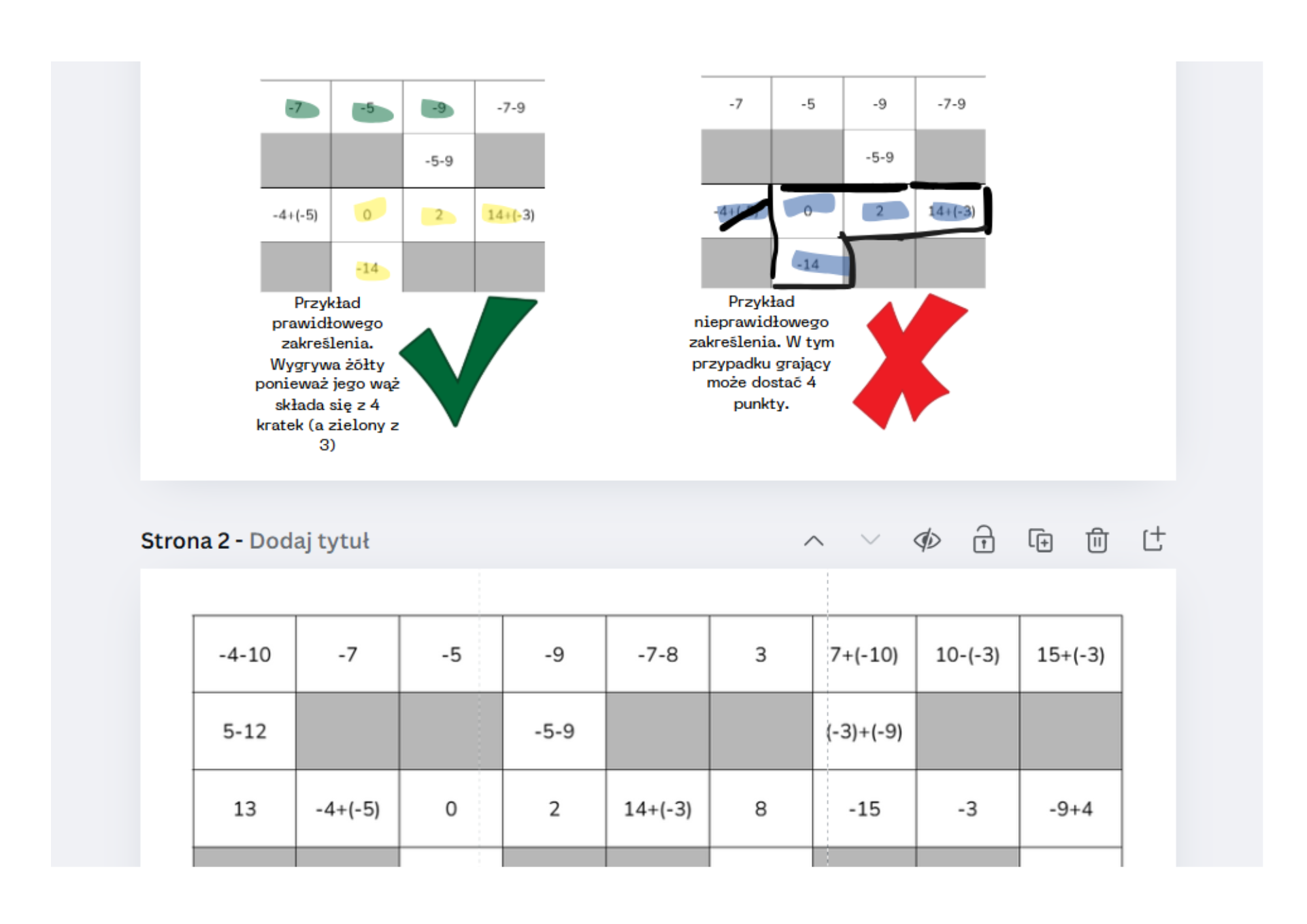 Potrzebna jest jedna plansza na grupę. Każdy z uczestników wybiera kolorowy pisak. W swoim ruchu zaznacza działanie i jego wynik.