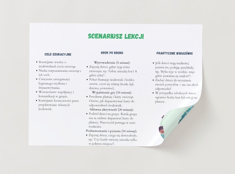 - Plansza do gry – kolorowa i podzielona na cztery środowiska: woda, ląd, drzewa i powietrze, które stanowią „domy” dla różnych zwierząt.