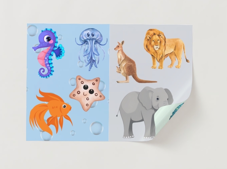 - Karty zwierząt – 24 unikalne karty z ilustracjami zwierząt (np. lew, delfin, papuga) oraz ciekawostkami o ich życiu.