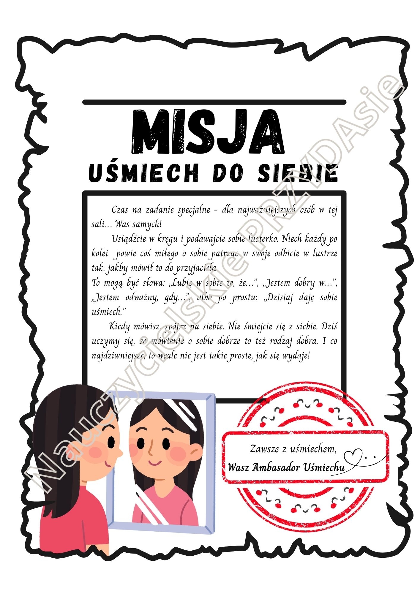 Dzieci podejmują Tajną Misję Dobrych Emocji i przez kolejne dni (lub dzień) wykonują zadania. Za każdą ukończoną misję otrzymują Pieczęć Uśmiechu (znaczek do paszportu).