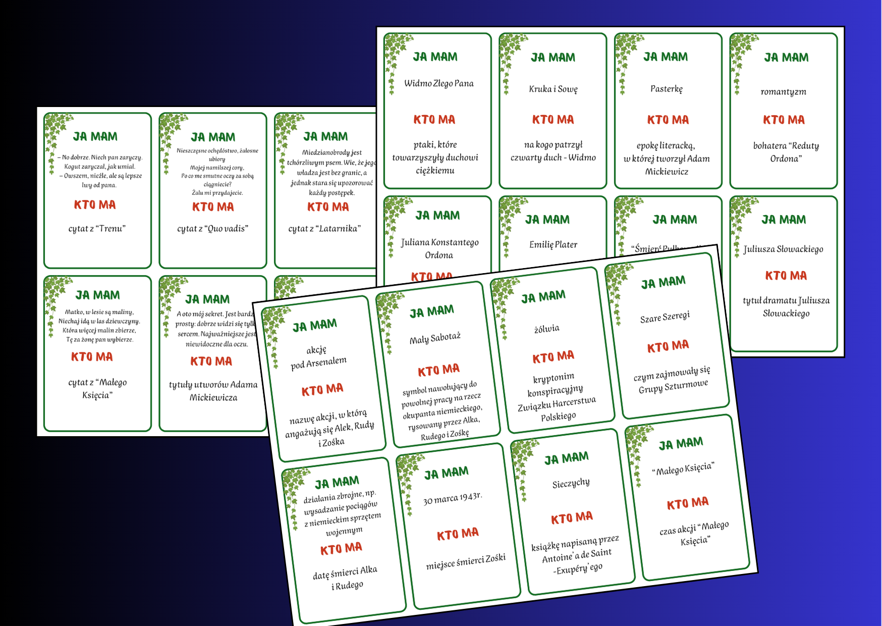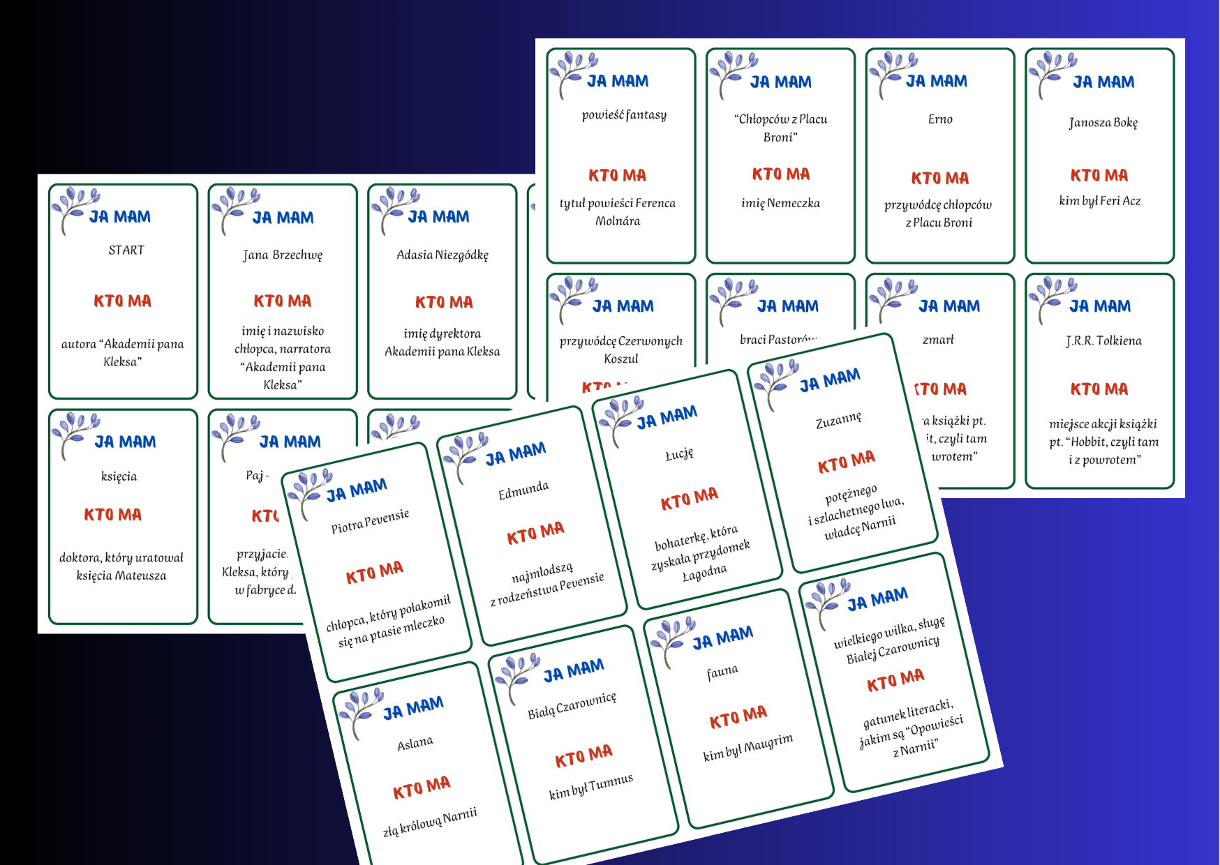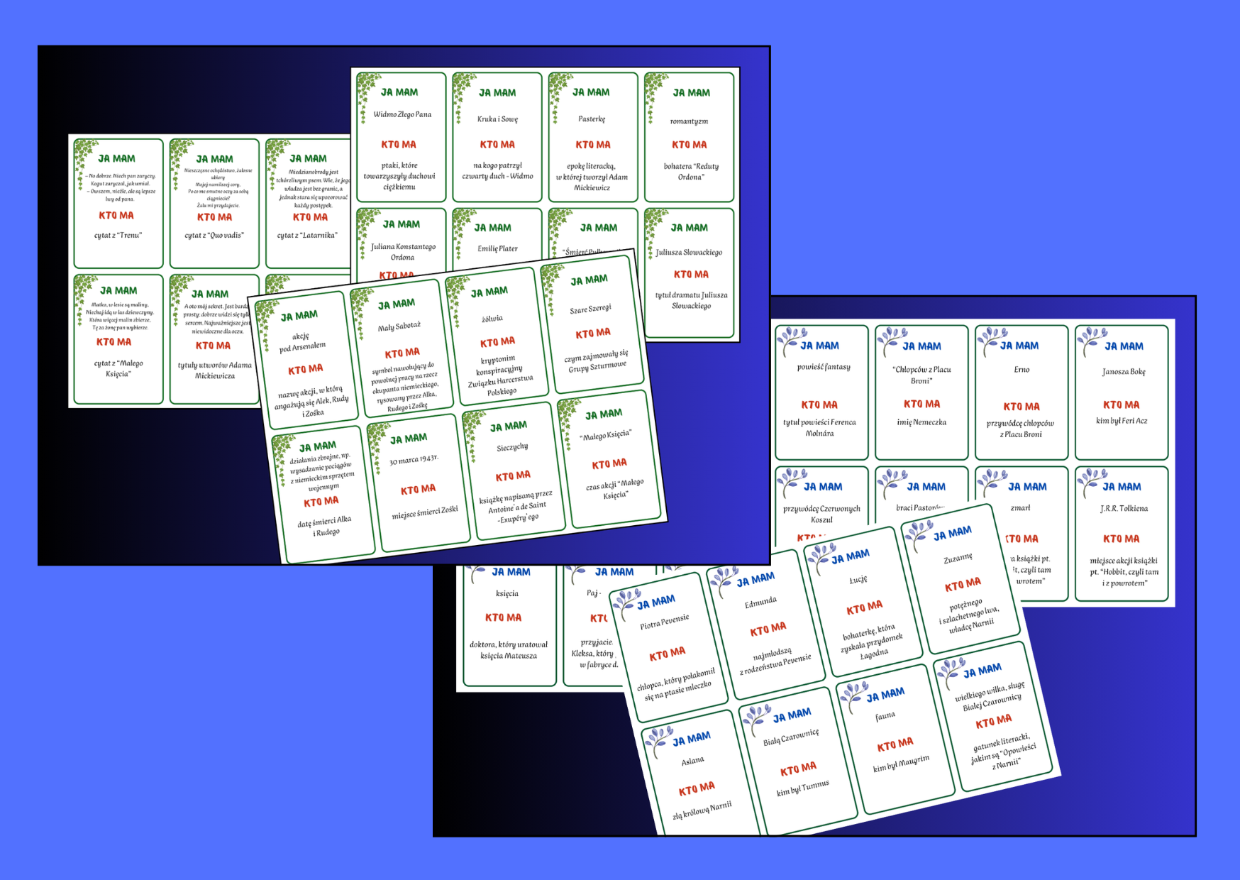 Zestaw 168 kart (21 stron A4 w formacie pdf), dotyczących lektur obowiązkowych z klas 4-8 (treść, bohaterowie), które po wydrukowaniu (można zalaminować, by dłużej posłużyły) trzeba wyciąć i rozdać losowo uczniom. Pierwszy uczeń zadaje pytanie: „Kto ma…”, osoba, która widzi na swojej karcie odpowiedź, podaje ją i czyta swoje pytanie (może też rozpocząć uczeń posiadający kartę ze słowem „Start”).