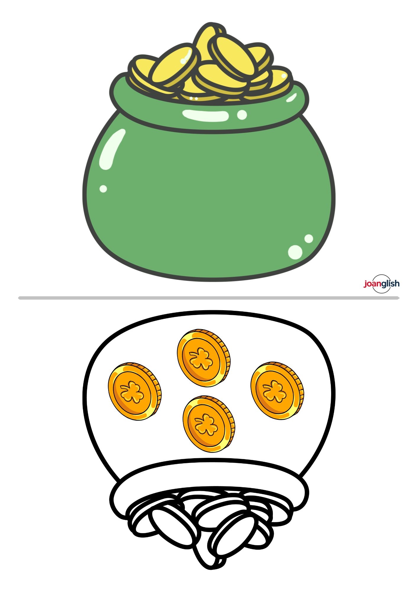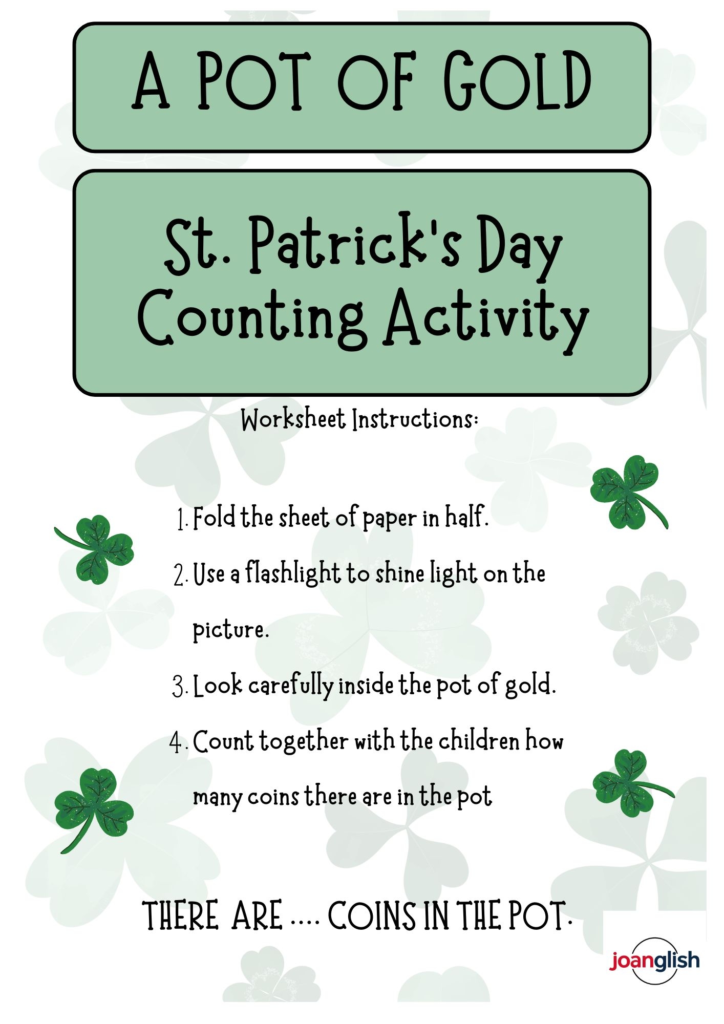 Materiał idealnie sprawdzi się podczas zajęć tematycznych związanych z Dniem Świętego Patryka oraz jako atrakcyjna aktywność matematyczna w edukacji wczesnoszkolnej. Zadaniem dzieci jest złożyć kartkę, podświetlić ilustrację latarką i policzyć monety ukryte w garnku ze złotem.