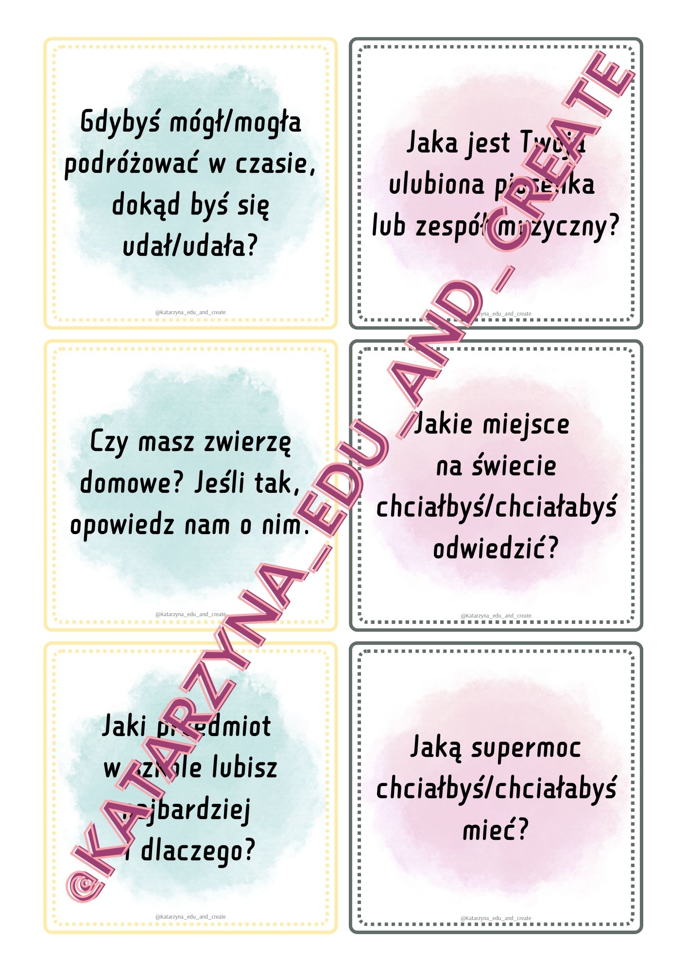 Kawadratowe karty z pytaniami, które mogą się przydać podczas pierwszych spotkań z uczniami po wakacjach, na świetlicy szkolnej, podczas przerw lekcyjnych lub w każdej innej sytuacji.